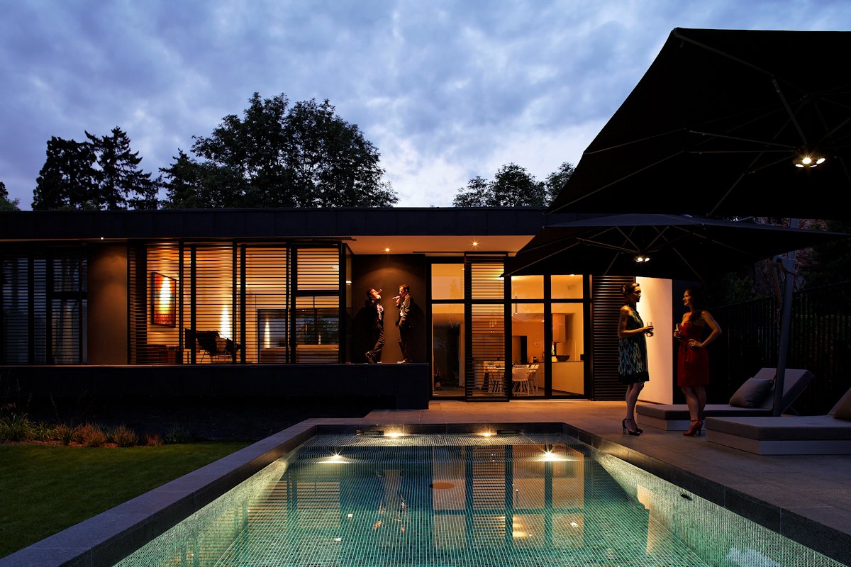 Choosing a single-level house offers the possibility of orienting all of the living spaces southwards. The solar gain is regulated during summer by an extended roof and controlled by sliding indoor blinds. The swimming pool and its terrace also enjoy great exposure to the sun. Its temperature is regulated by the solar panels on the roof. A heat pump provides the house with heat and hot water. The north position of the patio opposing the mineral soil of the south side emphasizes the temperature difference between the two sides of the house. This architectural system allows natural cooling by convection without air conditioning. The house is insulated from the outside due to the stability of the concrete slabs. As the architecture of this house integrates these sustainable development methods in its design, the appearance makes it less obvious which is eco-friendly at its finest: eco-friendly undetected.