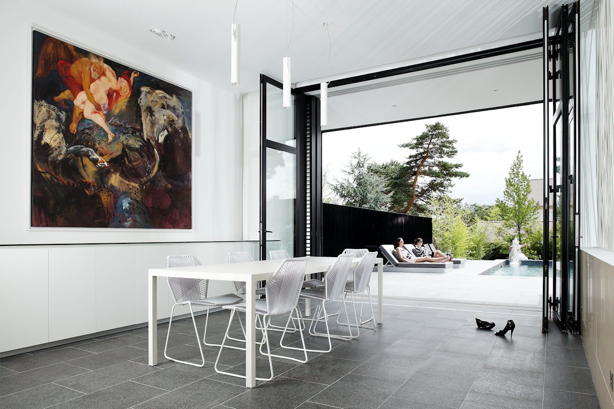 Inspired by the straightforward Californian architecture built to fit the suburb lifestyle, the house showcases cars as they come and go and puts the swimming pool at the center of life at home.