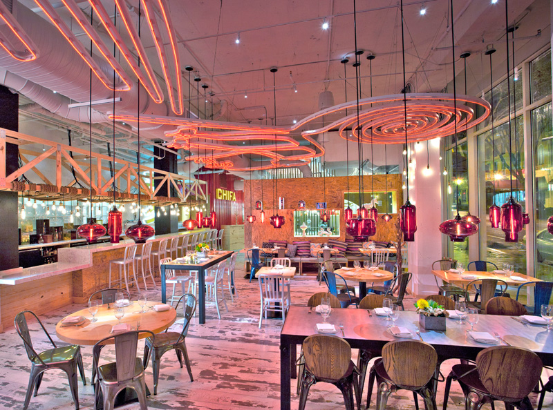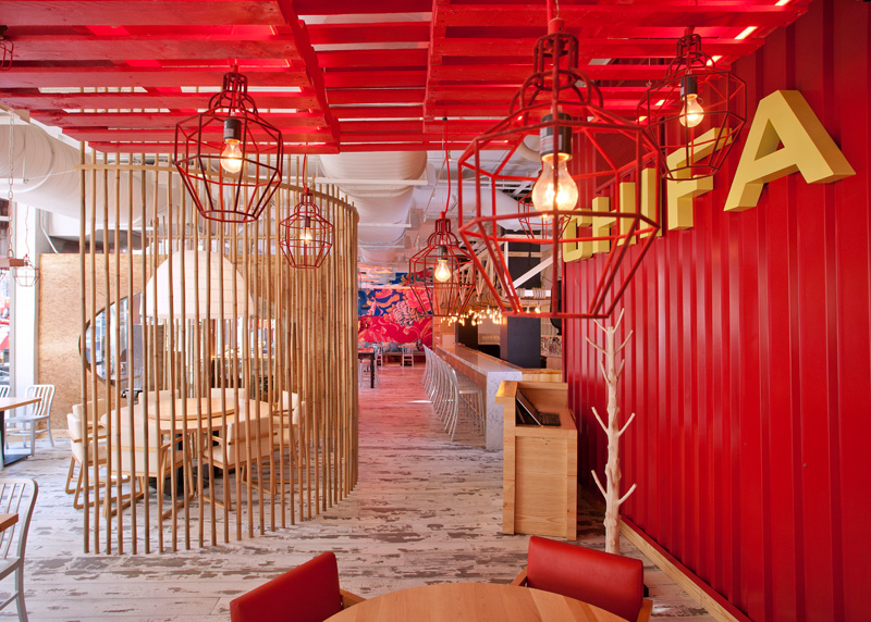 China Chilcano’s ceilings are decorated with neon lighting inspired by the Nazca lines, the series of ancient geoglyphs located in the Nazca Desert in southern Peru. The overall design line of this concept is based on simple elements: recycled crates, ladders hanging from the ceiling, and corrugated steel panels; along with pave or glass brick walls and wood truss eschewing elaborate finishes for a simpler space.