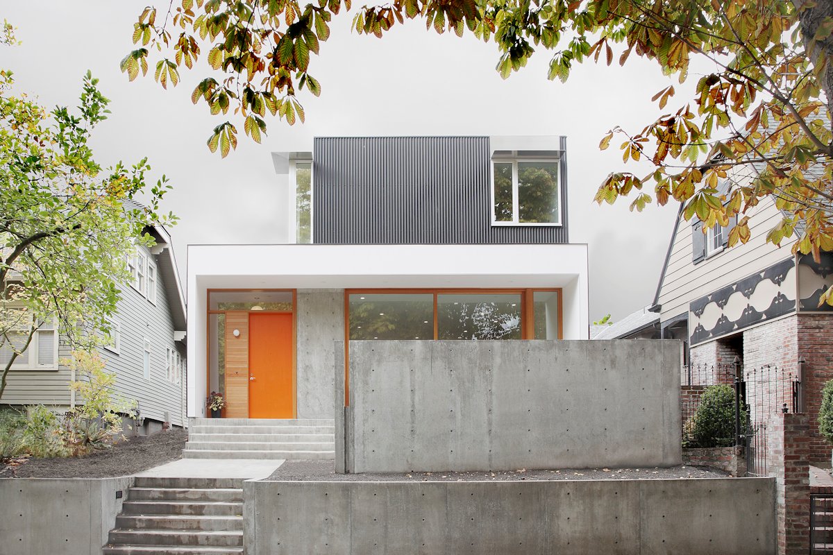 By focusing areas of glazing and extending the ceiling and walls beyond the line of enclosure the house establishes a strong connection to its front and rear yards while shielding its occupants from multi-family buildings along the sideyards. A walled and elevated terrace extending from the sunken living room claims the front yard as occupiable space and shields the living spaces from traffic on the arterial below. Corrugated metal siding and concrete site walls were used where privacy was desired, while wood windows, doors, and siding were used at the sheltered open ends where people interact directly with the building’s exterior.Distinct Solutions