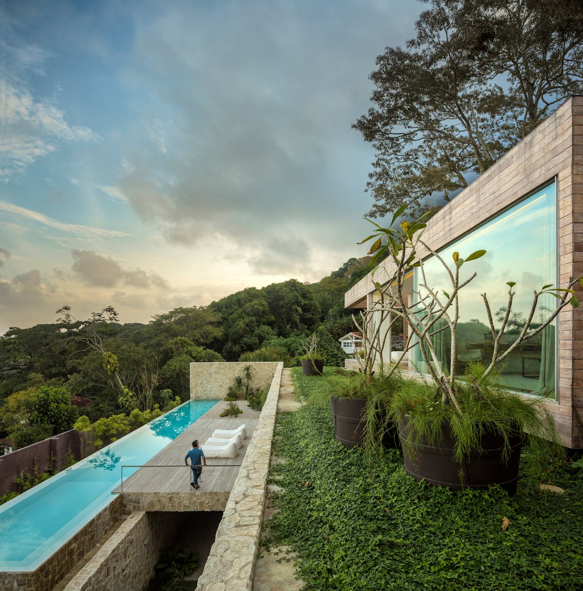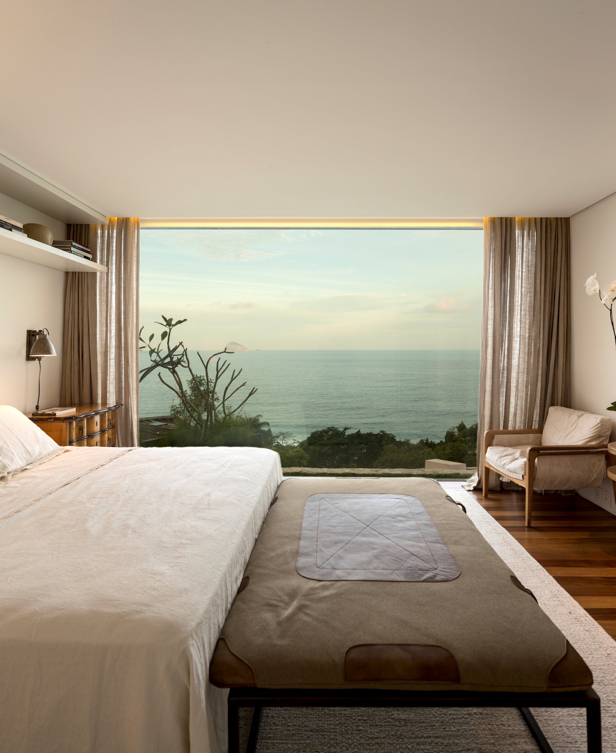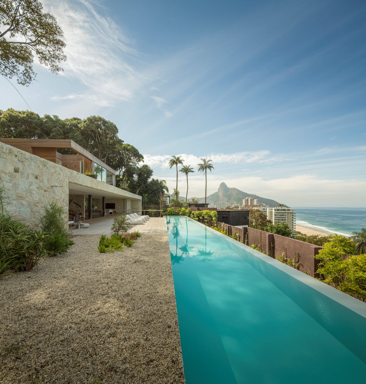 house right from the beginning with the architects, starting with choosing the right plot.Located in the hills near São Conrado beach, the plot intrigued the client, as it had no direct view to the sea nor would be the best choice to contemplate the landscape. “For me it was clear we would be able to reach the view. I assured him that all the social areas would be intertwined with the landscape” affirmed Arthur Casas. The solution was to raise the entrance, the social areas and the pool to the second floor, above the guestrooms and service quarters surrounded by a garden. The spectacular views are present in all the living areas. Large glass panels slide and hide behind the walls in order to erase the borders between inside and outside. Great spans amplify spaces that have the same dimensions of a conventional construction. A third floor, with smaller proportions, houses private dependencies such as the master suite and the home office, both oriented to the horizon.