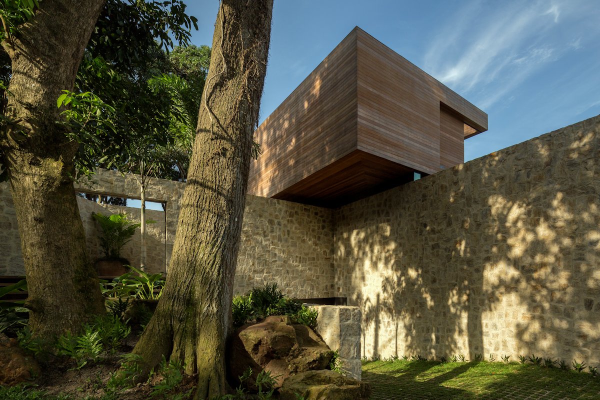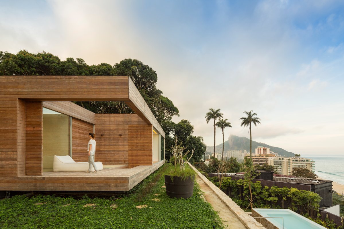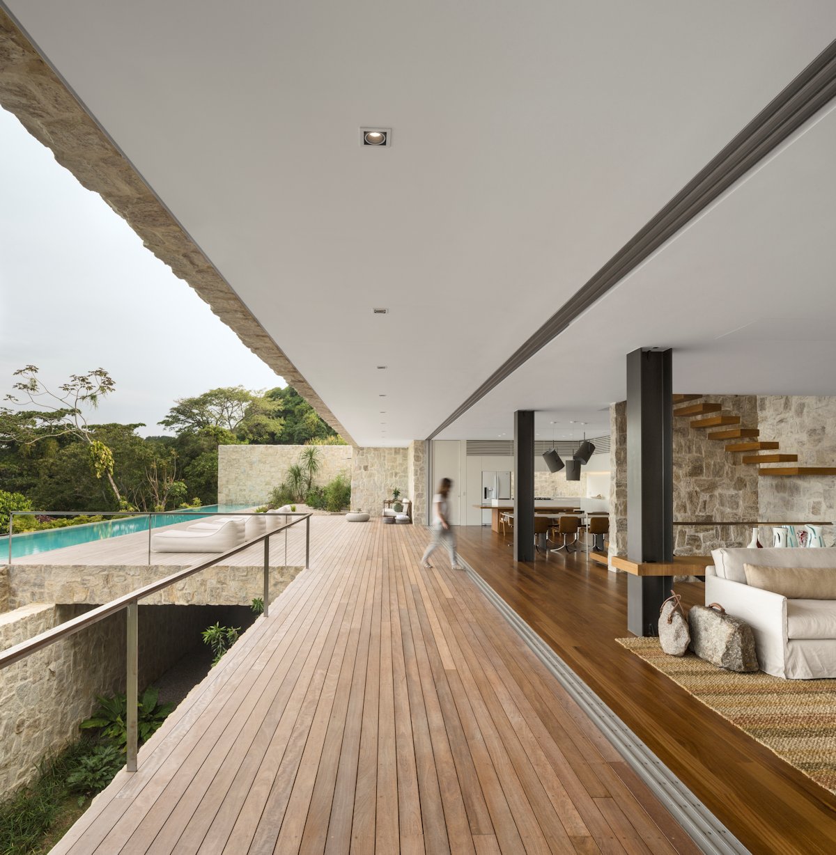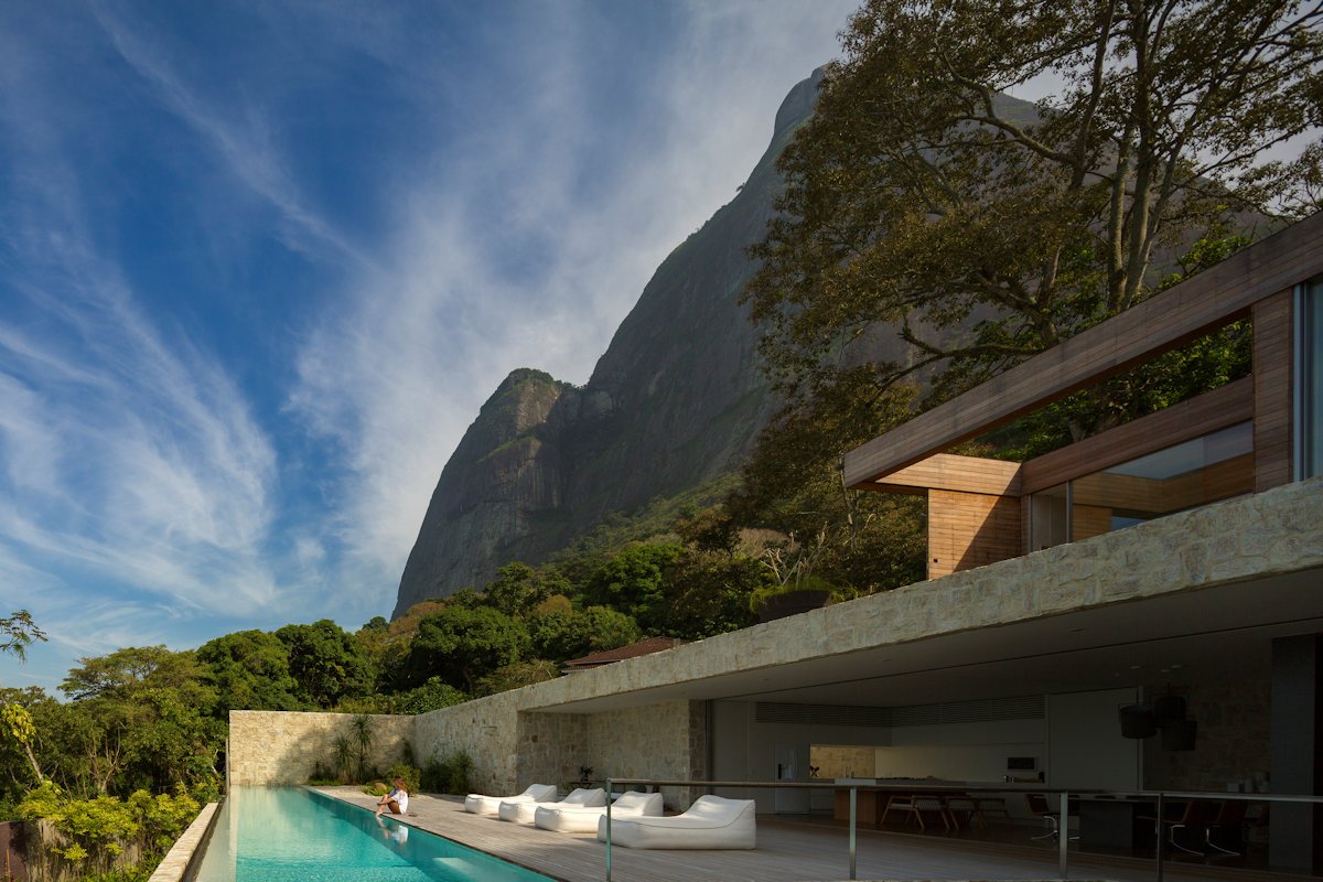 house right from the beginning with the architects, starting with choosing the right plot.Located in the hills near São Conrado beach, the plot intrigued the client, as it had no direct view to the sea nor would be the best choice to contemplate the landscape. “For me it was clear we would be able to reach the view. I assured him that all the social areas would be intertwined with the landscape” affirmed Arthur Casas. The solution was to raise the entrance, the social areas and the pool to the second floor, above the guestrooms and service quarters surrounded by a garden. The spectacular views are present in all the living areas. Large glass panels slide and hide behind the walls in order to erase the borders between inside and outside. Great spans amplify spaces that have the same dimensions of a conventional construction. A third floor, with smaller proportions, houses private dependencies such as the master suite and the home office, both oriented to the horizon.