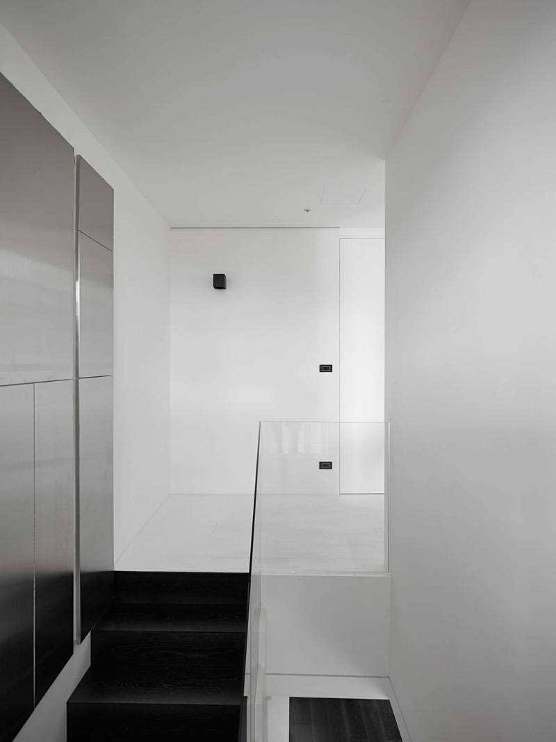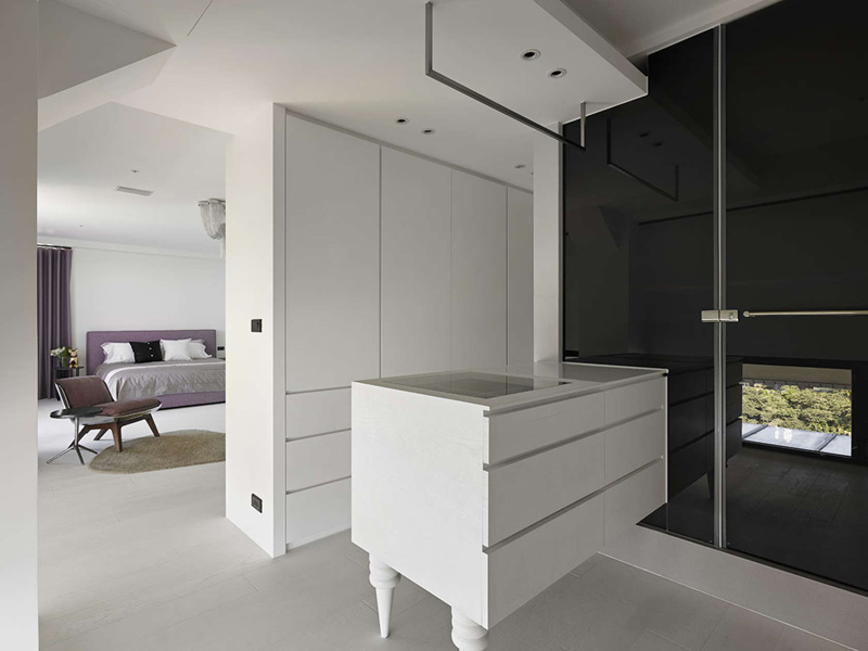 The lower layer is used as a common area. The overall adoption starts from black wood floors. Designers connected the open kitchen with a long dining table. By doing so, the users in the house can feel a sense of extensiveness. The main wall in the dining room is cement finish plus dyed veneer and painted glass, creating a multi-layer color change.