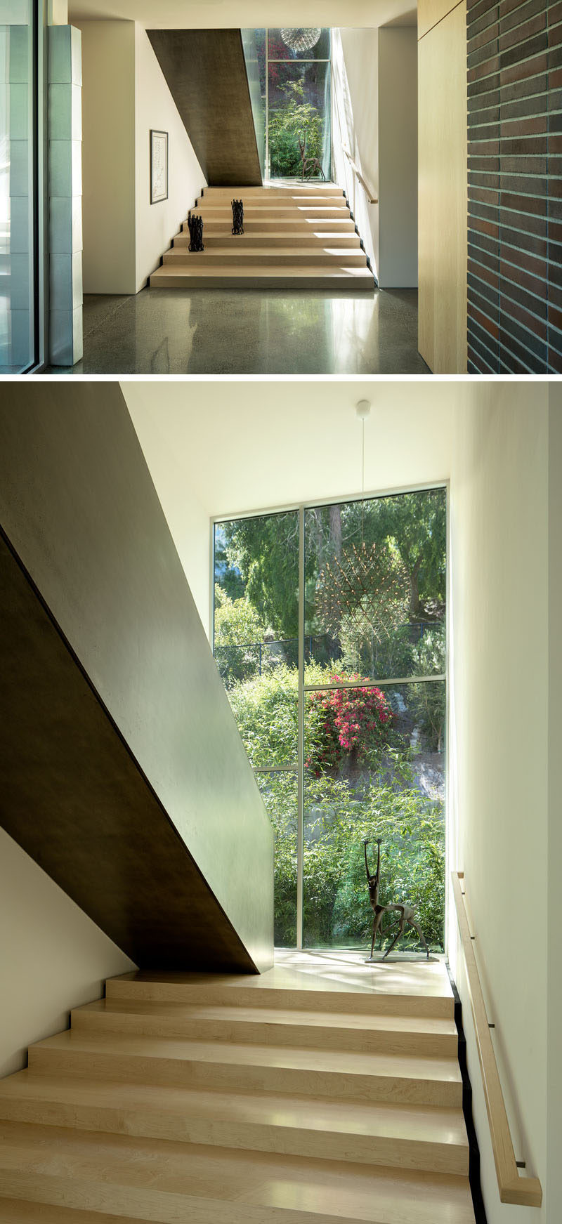 Leading up to the second floor of the home is an architectural staircase made from wood and steel that sits at the core of the house.