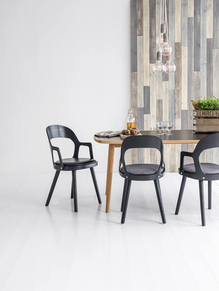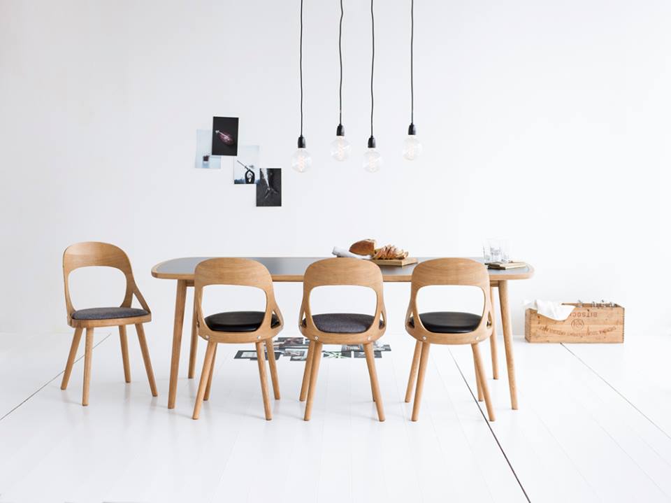The finish is either white lacquered birch or dyed black elm, or opt for oiled natural or blonde oak. There is also an accompanying slender table with a border in massive oak and a durable table-top in melamine.