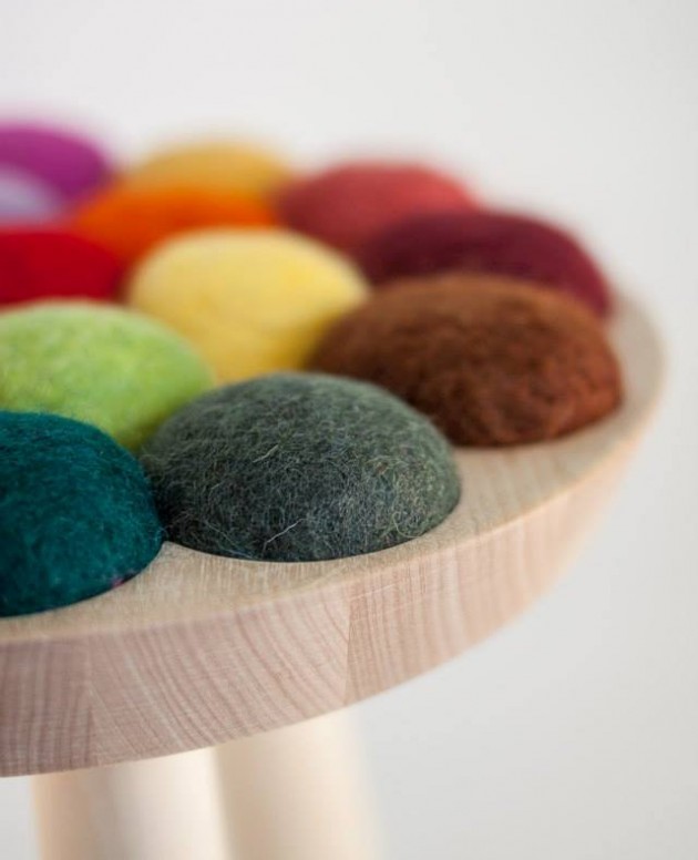 Inspired by the lambs on the spring fields, this colourful stool made in birch and felted wool came to life.