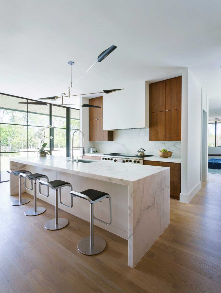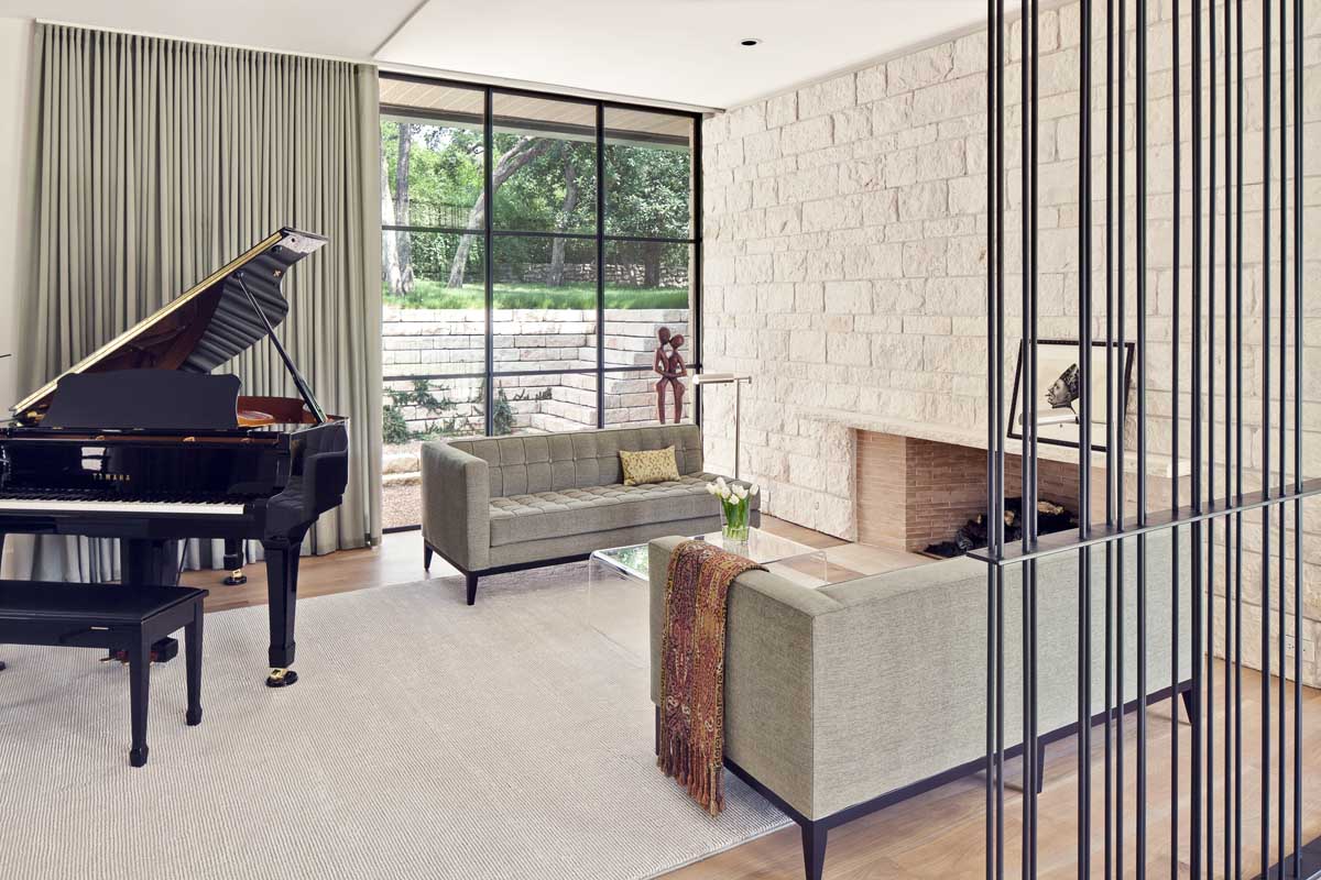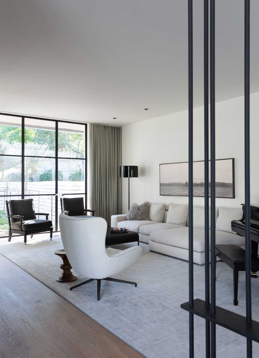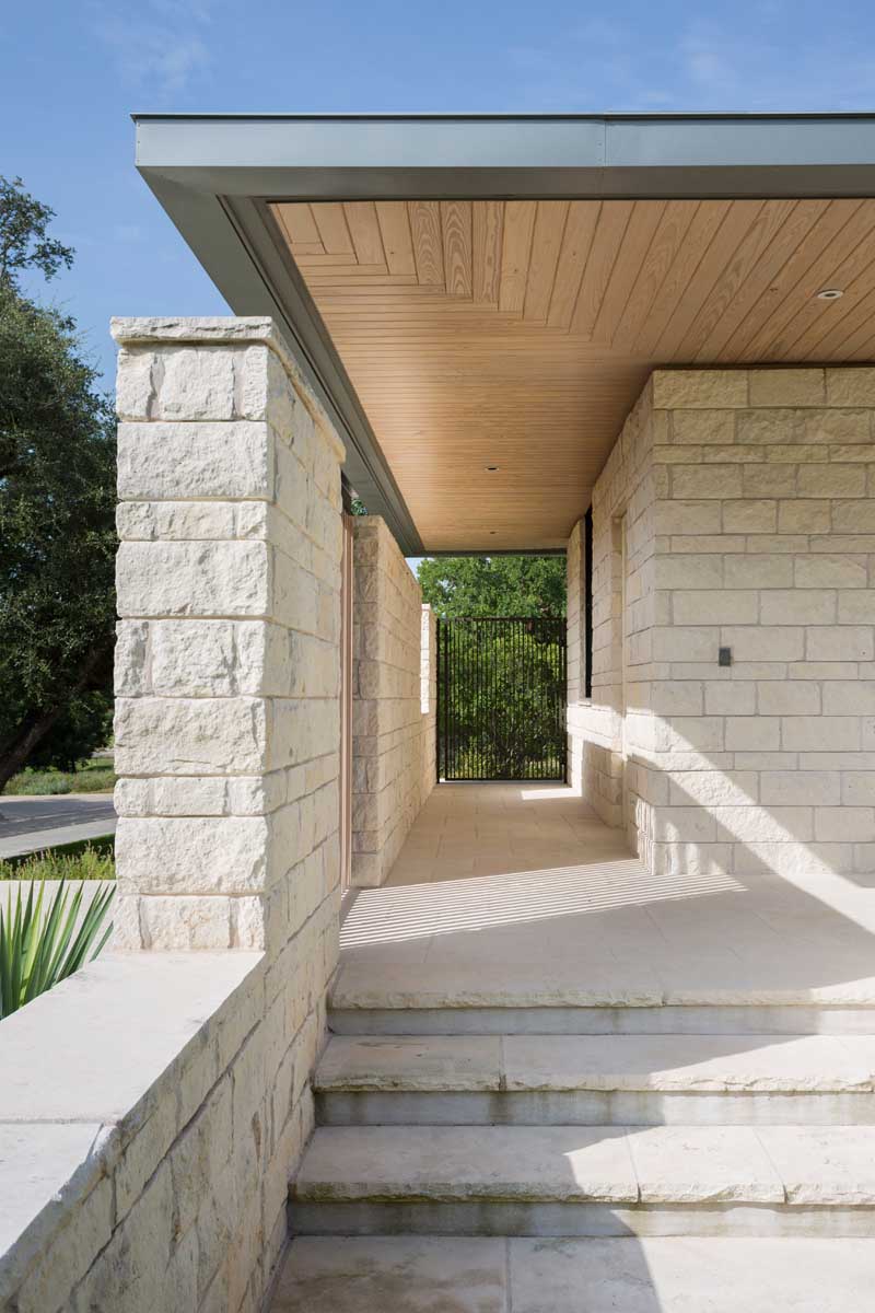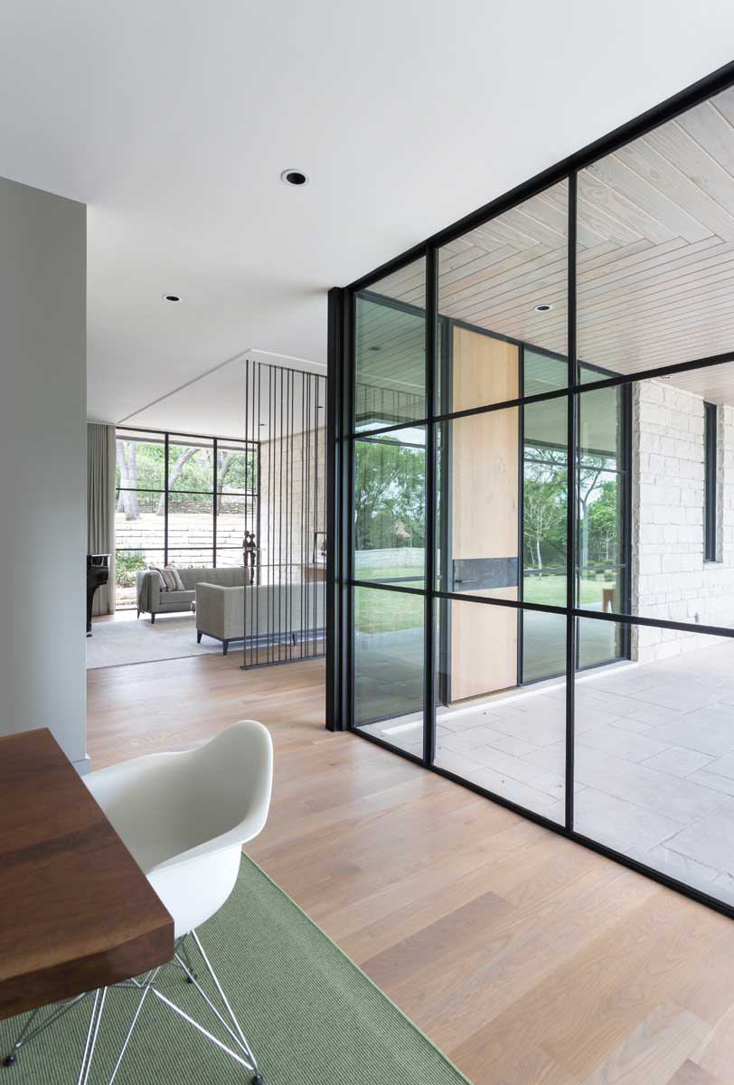 With little protection from shading trees, exaggerated overhangs help protect the transparent façade and provide continuous outdoor living space between interior and courtyard. Simple, well-crafted details are carefully edited so as not to compete with the texture and reflections of the true divided lite steel windows.