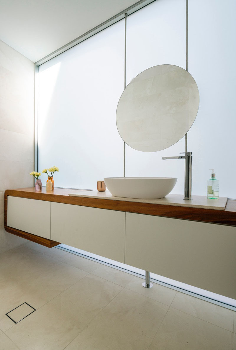 Here’s a look at one of the bathrooms in the home. A round mirror matches the curves on the oval sink, and the wood vanity breaks up the white found throughout the rest of the bathroom.