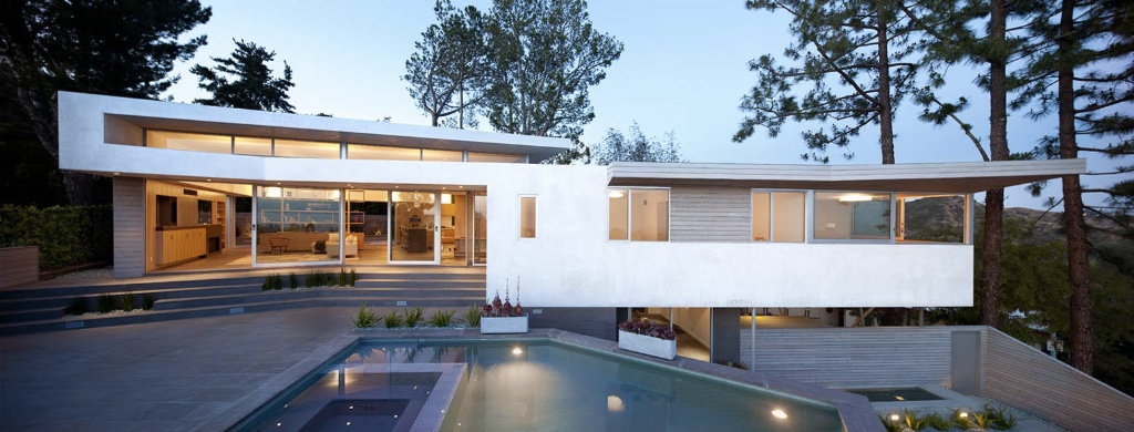 This custom residence lies near the apex of Beachwood Canyon, in the Hollywood Hills just under the shadow of the Hollywood sign. Utilizing the existing footprint of a previous home, this new residence is comprised of two main rectangular volumes which are shifted off-axis from each another to accentuate the difference in program which lies within. The more public “living” areas of the house are situated on the ridge of the site, so as to take advantage of flanking outdoor spaces which are designed as extensions of the living dining, and kitchen areas. Large expanses of sliding glass panels connect these spaces to the adjacent terraces and views beyond, inverting the interiority into an open, covered outdoor room.