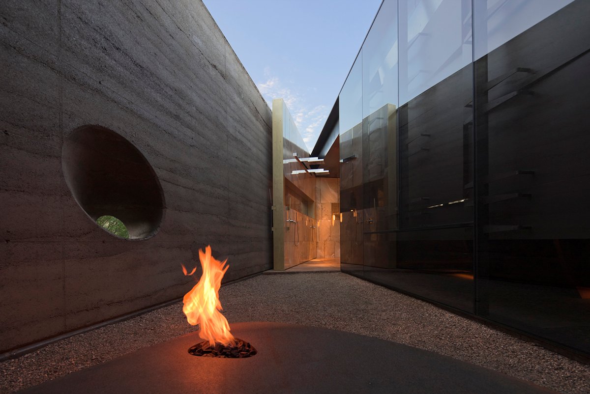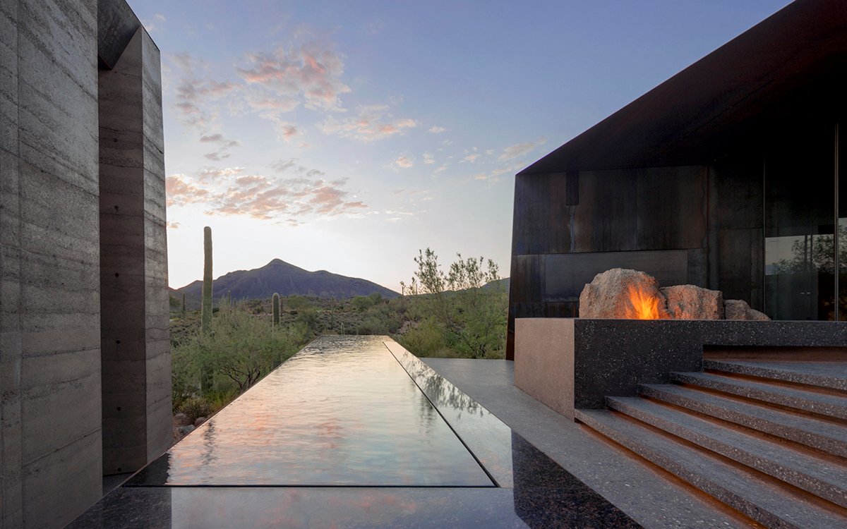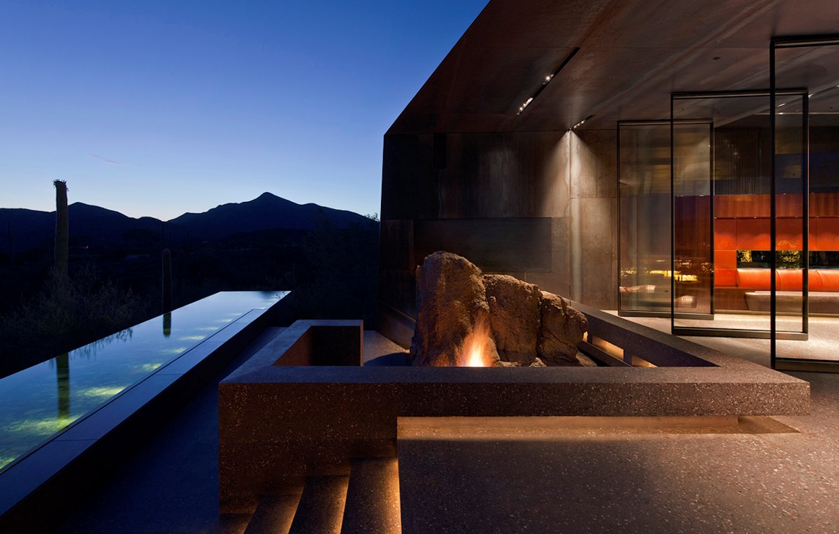 Mass, Hollowed Mass, Faceted Mass, Fissured Mass, Mass that cracks open and hinges apart informed how we proceeded to give this home its defining qualities from the courtyard plan, to the split-massing, all the way down to the fittings and fixtures that one touches with the hand or the eye. For instance, the millwork is volumetric only revealing contents within when a contoured bronze void is touched with the fingertips allowing the mass to be gently cracked open. Long fissures in the mill-finish steel plate ceiling reveal light while maintaining the quality of nothingness at night. Mass and the improbability of delicacy discovered within it, is what gives the Sonoran Desert its remarkable presence. As our clients and their guests move into the mass of this landform into our Engawa, we hope they will always rediscover with a hint of surprise the preciousness of things.