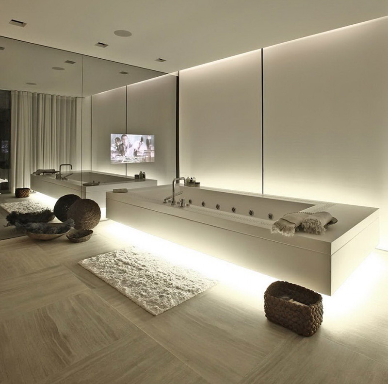 The bathtub in the master bathroom of this home, whose interior was designed by Tanju Özelgin, has lighting that has been hidden underneath an overhanging surround. When illuminated, it makes the bathtub appear to be floating on a cloud of light.