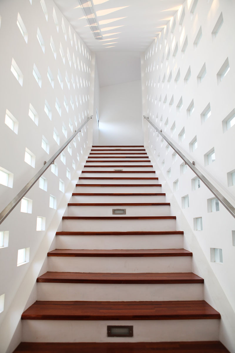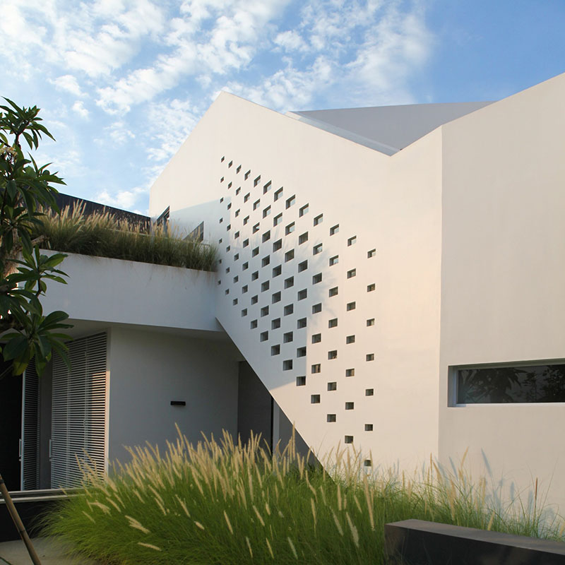 When Ivan Priatman Architecture designed this home in Indonesia, they included a gradient of small windows embedded in the walls on either side of the stairwell, which allow natural light to enter, while maintaining privacy for the people inside.