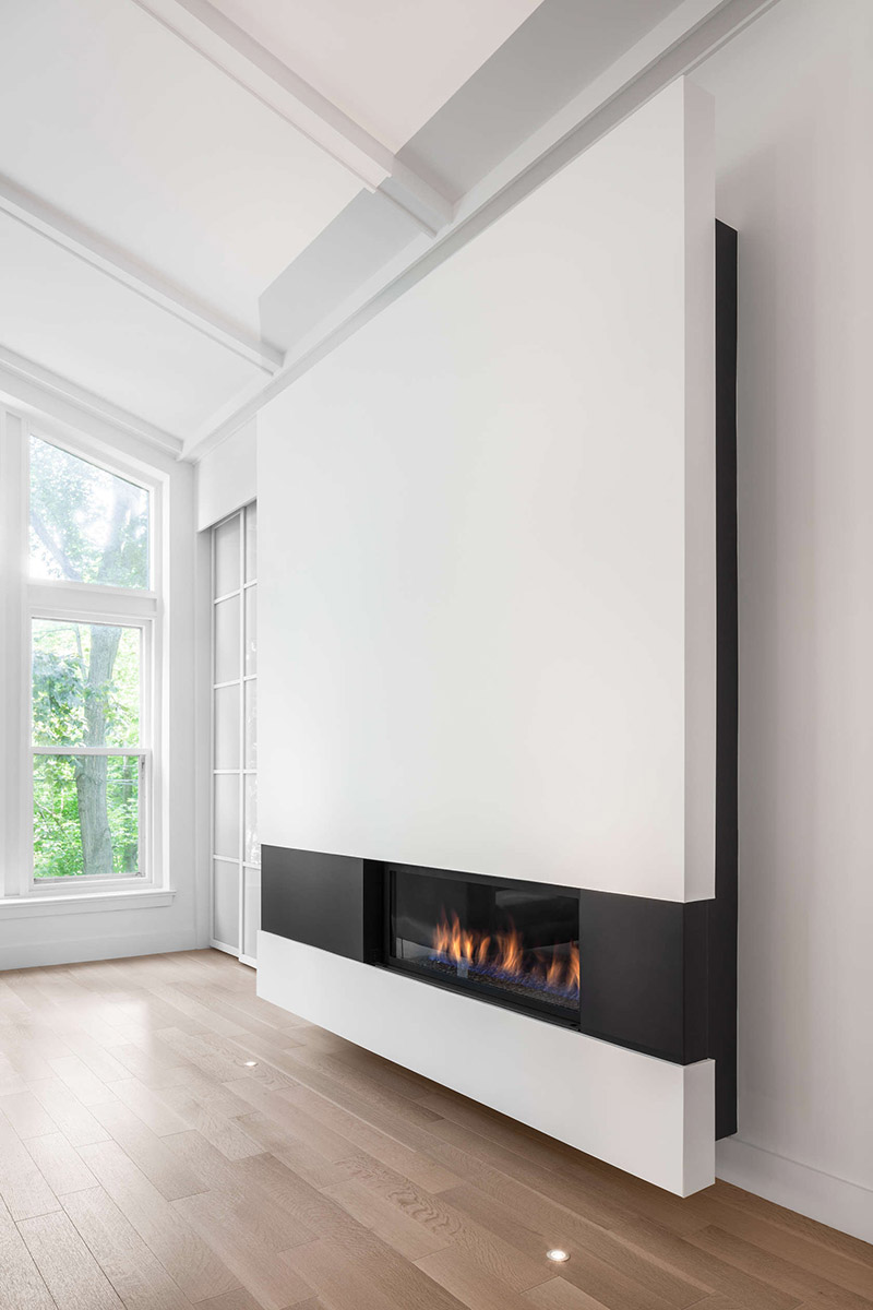 Thellend Fortin Architects, included this white modern minimalist fireplace surround, in a home they designed for a family in Montreal, Canada.