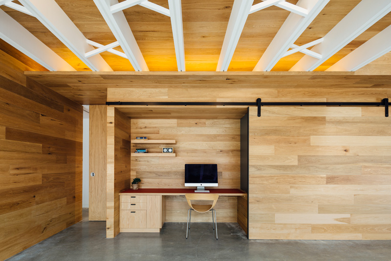 This home, designed by Moloney Architects, uses a large sliding barn-style wooden door, to hide the home office from the dining area.