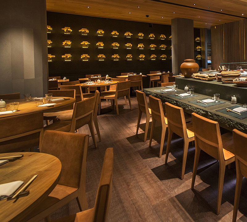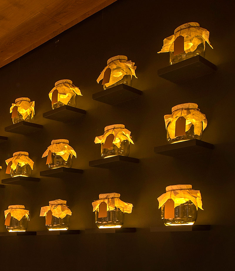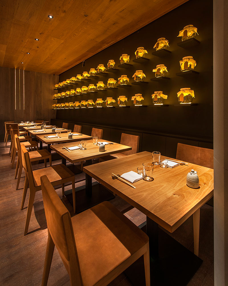 Hey contemporist friends! Here’s a real mood-setting decor idea for you. The recently completed Aldwych location of the ROKA Japanese restaurant in London, features this wall of glass jars filled with Shochu (a type of Japanese liquor). The jars are all sitting on their own little shelves, which have LED uplighting in them, creating a glowing light-filled feature wall.
