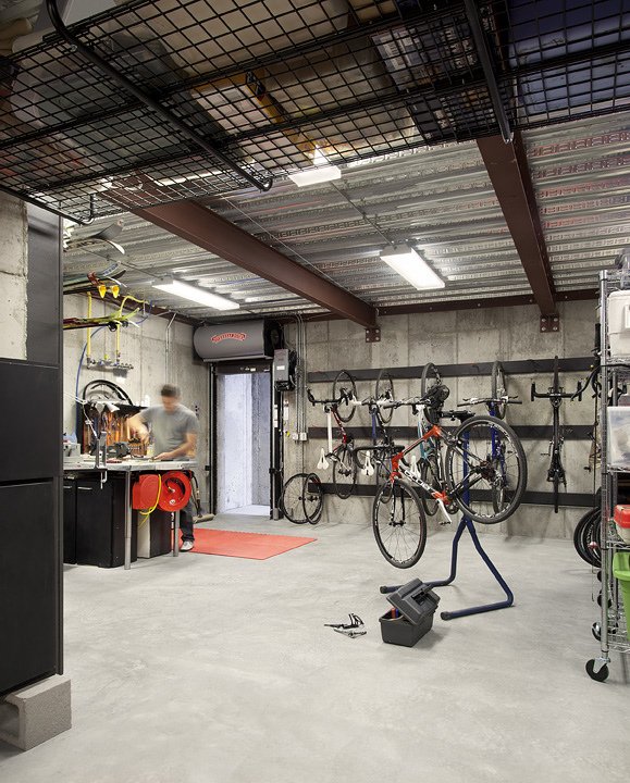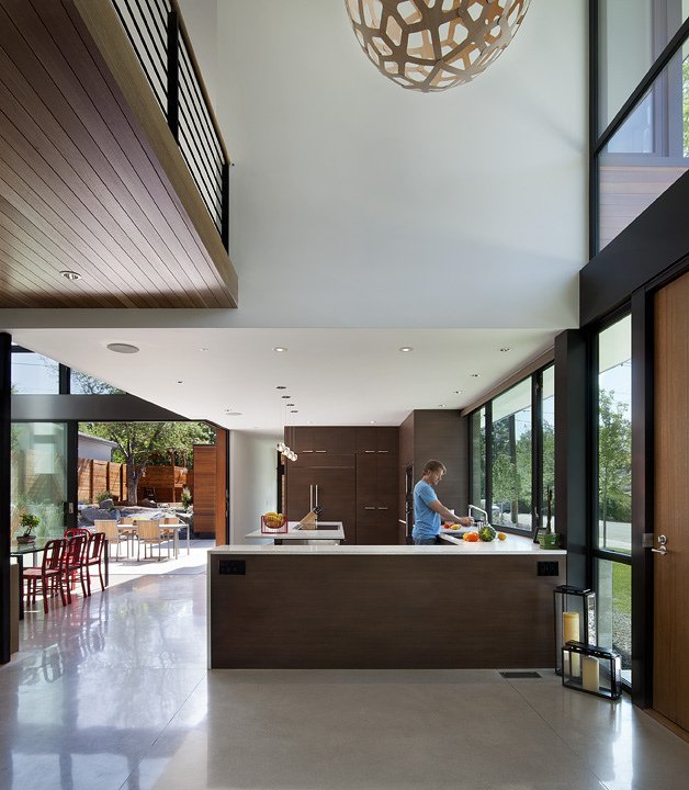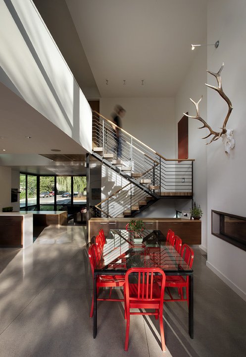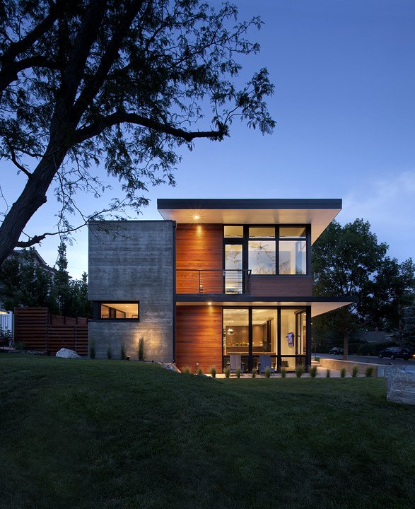 This modern urban house is anchored on a downtown corner site. An all glass living room Site-cast, board-formed concrete walls moor the building to its site, while providing thermal mass to control temperature swings. The house is organized around crossing dihedral lines, one phenomenal, one tectonic that shear the interior volumes of the house. The building was delivered as a fast-track, design-build with Hammerwell inc.