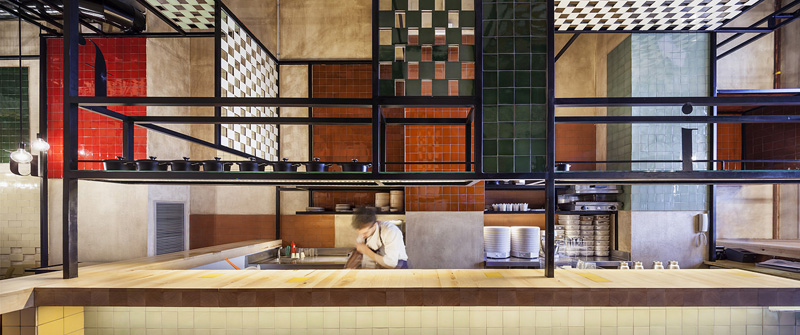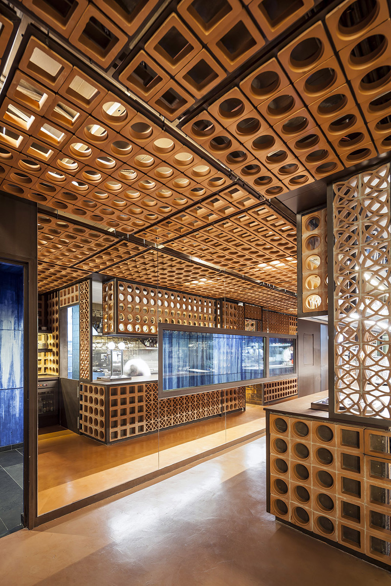 The kitchen is the oven of the restaurant, both real and metaphorical, as it is from there that all activity emanates. Here we use ceramics in their most humble and rugged format: pieces of, baked bricks in their natural color, form a permeable limit through which the guests can see the interior of this oven, golden and warm.