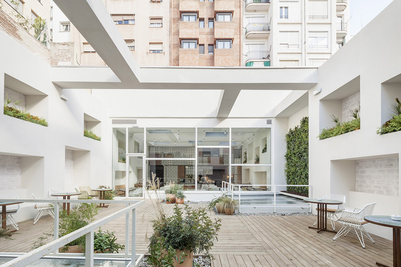 The entrance area contains more urban references, like the metallic structures of the antique Ninot food market across the street. In this area we use ceramics in a colorful, artistic way, with panels of monochromatic tiles which surround us as if they were part of a deconstructed mural by Miró, the artist.