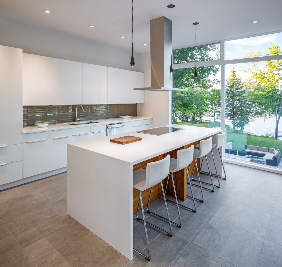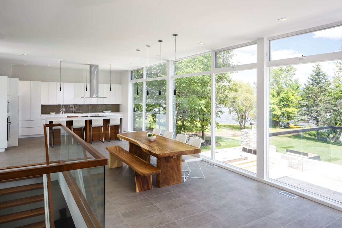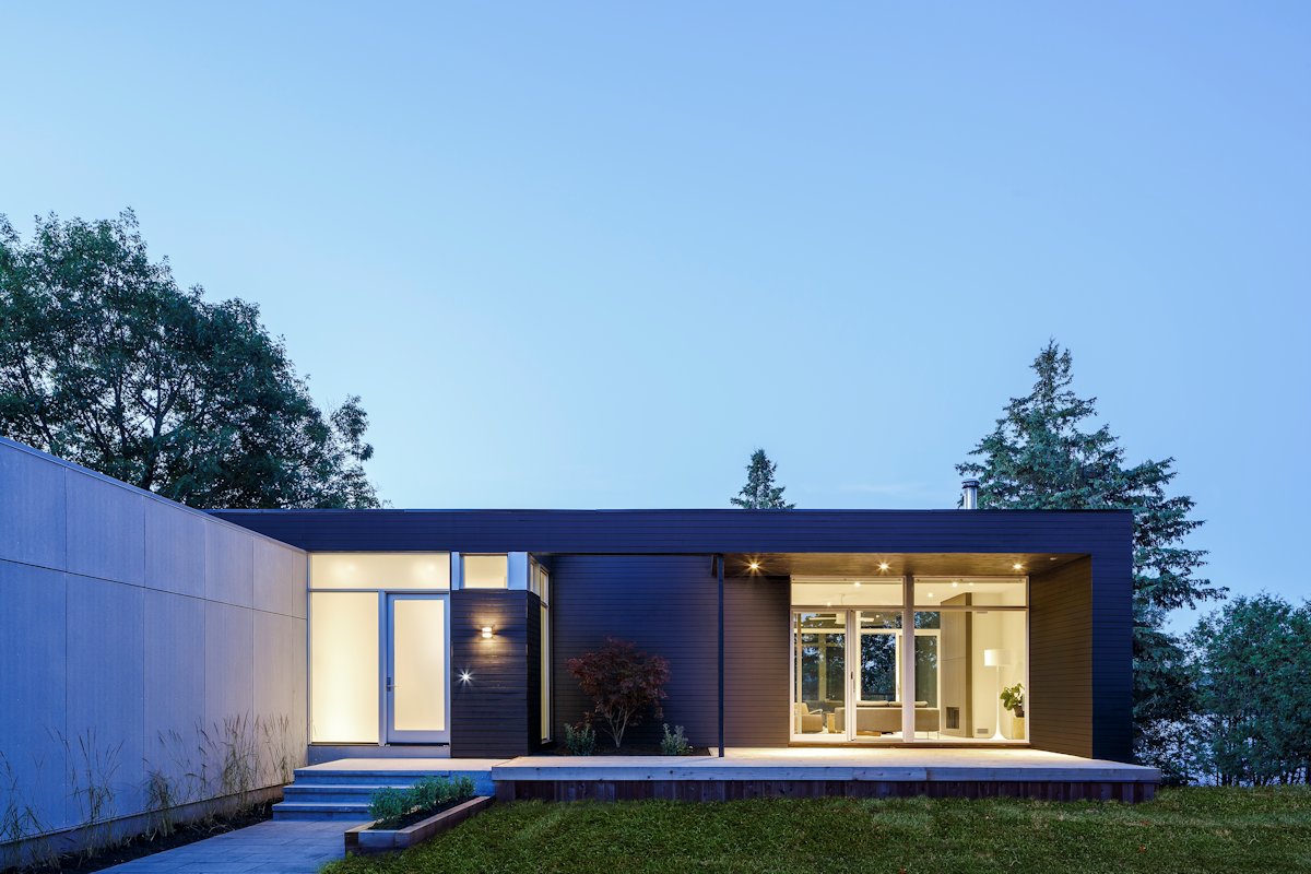 Simplicity and openness define the experience of being in this modest home. To the river, a continuous wall of glass spans the living, dining and kitchen space allowing a full panorama of the passing seasons.