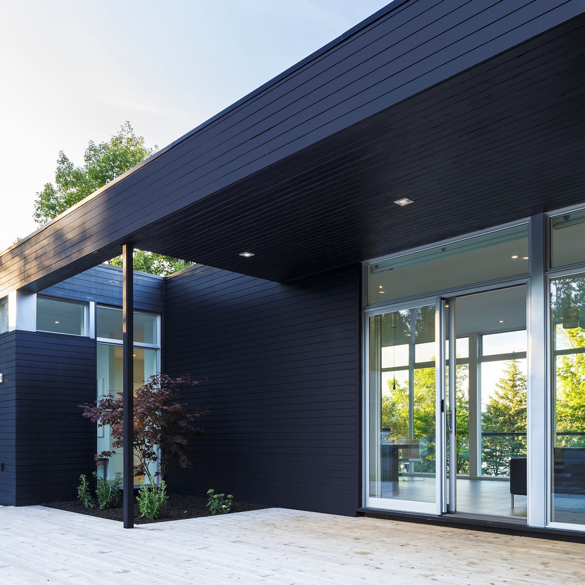Away from the water the view is framed and edited by a simple porch. The porch roof has been opened to create space from nature, a single Japanese maple which is inserted as a foil to the simple black stained cedar cladding of the house. The garage volume is differentiated from the house by a cladding of grey cement board.