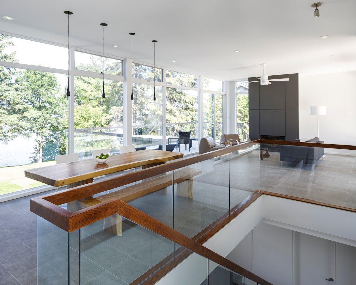 To the river, the simple cantilevered form of the deck is surrounded by frameless glass. The porch and deck, occurring opposite each other, stretch the space of the living room out into an experience of the landscape and provide varied options for sun, shade, shelter, and view.
