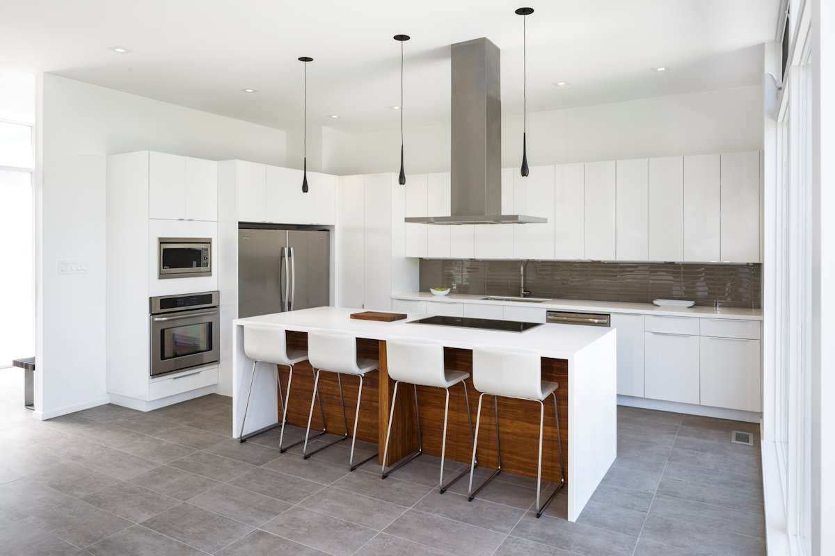 In the kitchen, high gloss cabinetry with sleek pulls and a glass tile backsplash create a custom look while staying within the modest budget.