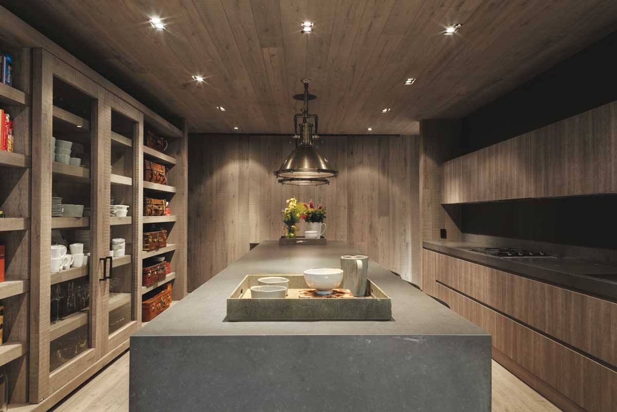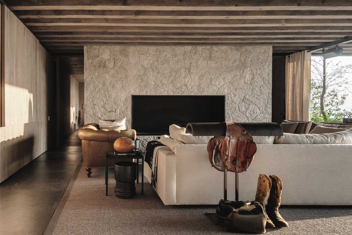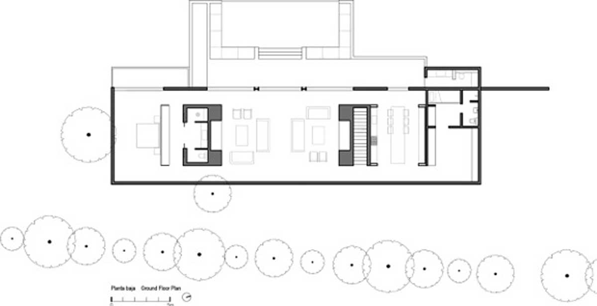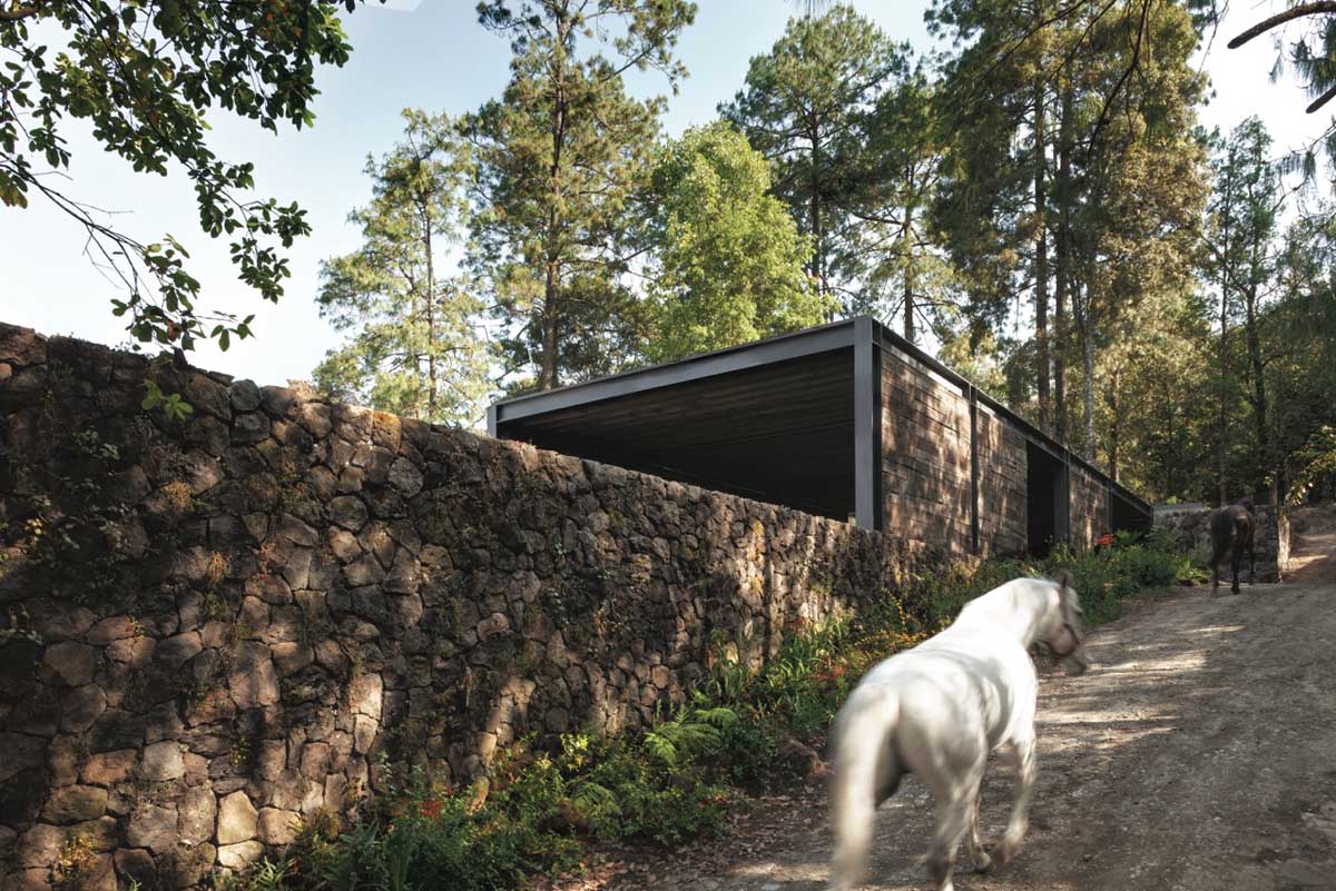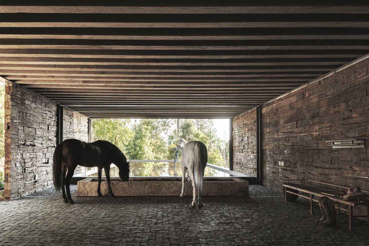 The architectural program is distributed with a family room that connects to the exterior, allowing the expansion of the social area to the main terrace. It has one bedroom with its own private bathroom. The kitchen has a large island in the middle with a countertop made of slate that allows it to also have the use of a dining table and a workspace. The relaxed architectural program and its flexibility in its spaces, reinforces the owner’s strong personality and intense social life. The main access collides with a large body of water that is parallel to a drinking space for horses, while a low wall made of wooden railroad ties discretely hides the area so cars may be parked and appear to be isolated from the construction.