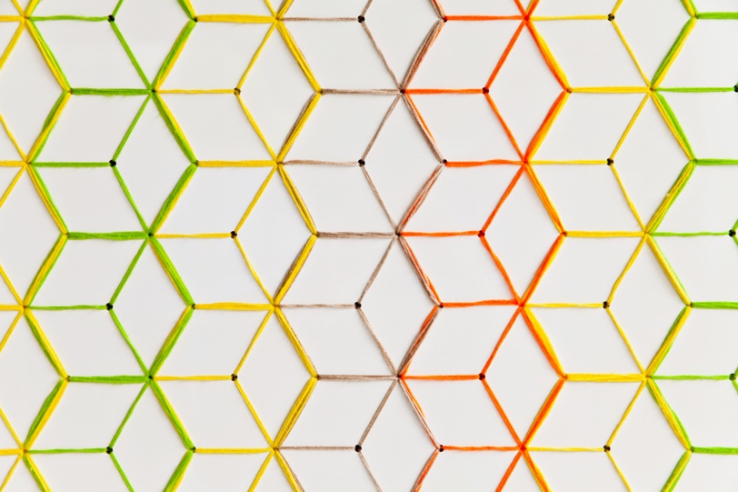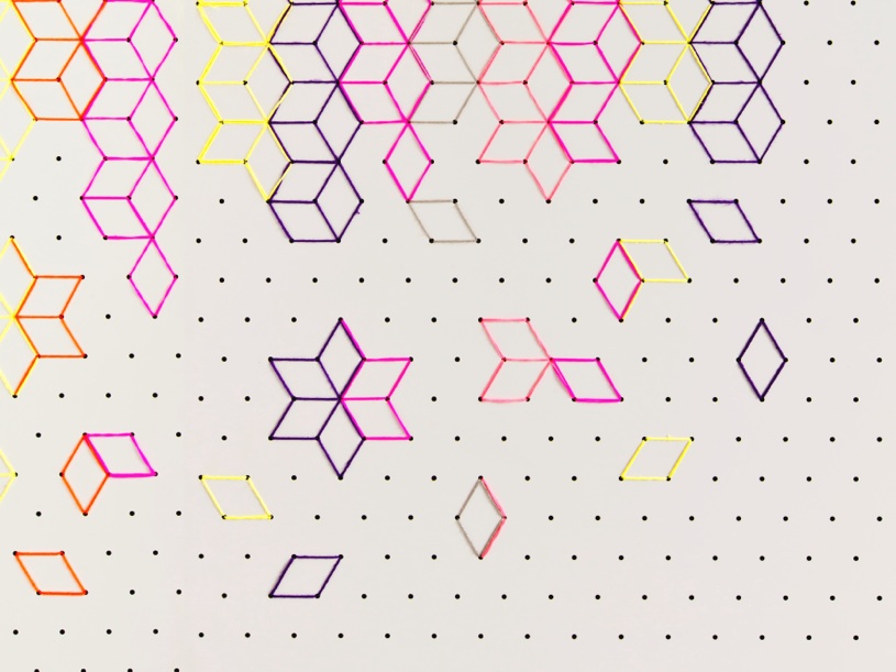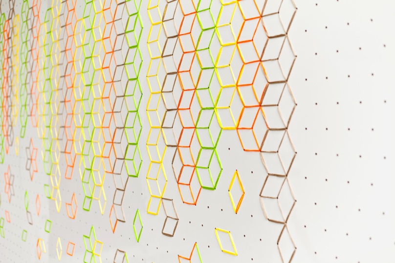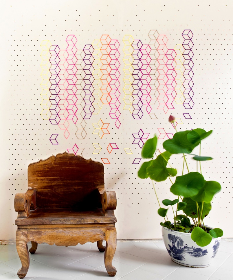 The wall is characterized by a sequence of tiny dots that creates a perception of rhomboidal grids, this technique recalls japanese stitching art “Sashiko”. Colorful cotton yarn is sewed randomly between each dots to create vivid flower petal motif.