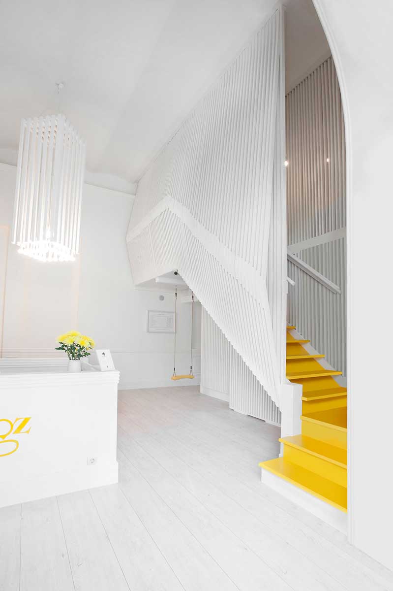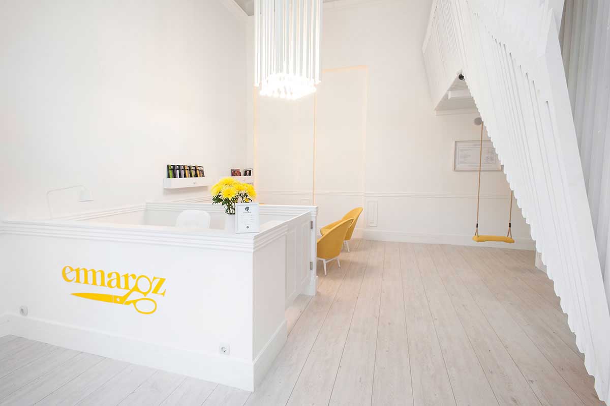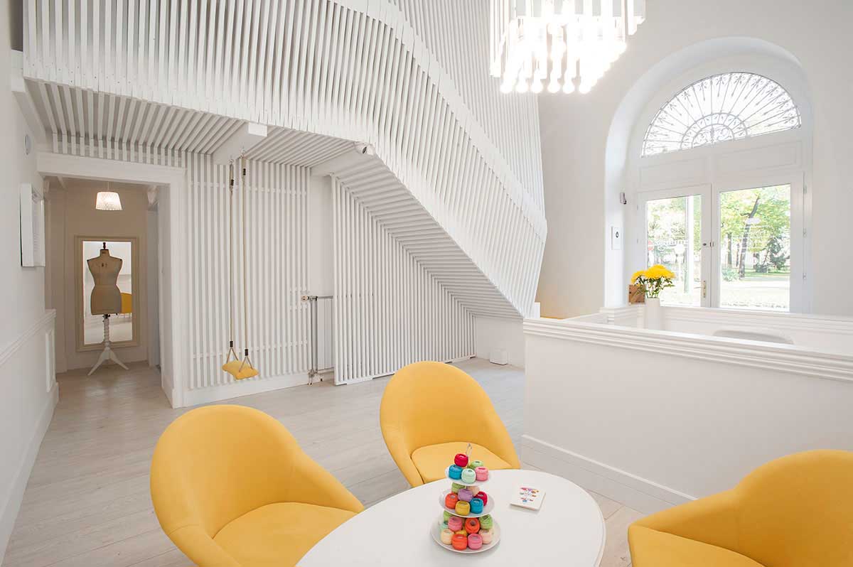 My inspiration for the interior design was femininity, purity and an original salon atmosphere. Entering through the door the customer is greeted by an imposing space, its center is a monumental architecture object, a staircase that leads to the gallery. The structure is similar to a loom. The vast chandelier has the same effect, it hangs above the receptionist’s desk. Other parts of the interior have a classic style in mind. There’s also a cafe corner, where people can talk or read. On the Provence styled table there’s a plate that is usually used for cakes, here it’s decorated with colorful yarns. They look like macaroons from the distance. This association is on purpose, the connection of confectionery and fashion fits this place very well, subtle yet feminine. Up to date fashion magazines and books are making our waiting time much more pleasant with little architecture details like the drawers on the wall – functioning as bookcases. For children you can also find a swing here, it’s a really important point in the design, the place got its name from the owner’s daughter, Emmaroza. The space is mainly white, with yellow retro easy-chair and a yellow staircase.
