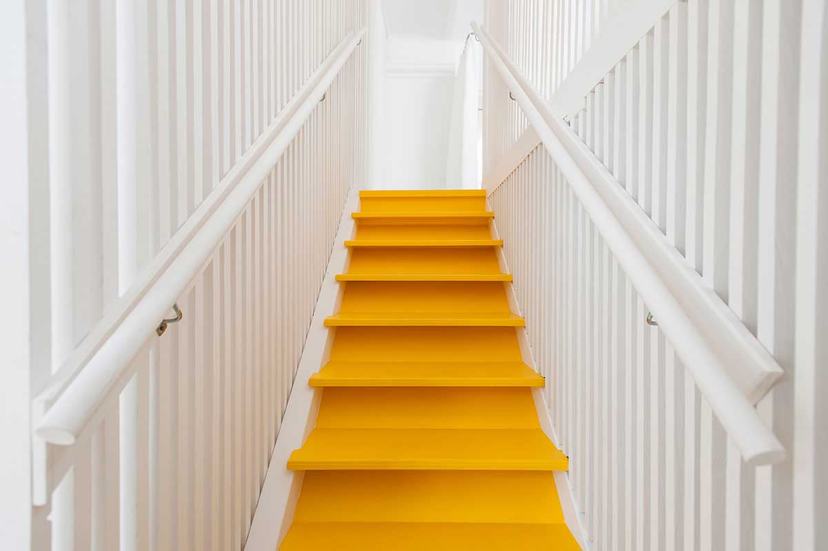 On the gallery you find a room where they adjust sizes of clothing. There’s a fitting room, yellow retro easy-chairs, and a shelf with the clients’ folders. A white curtain and a short corridor divides the space where the sewing room is. This area is reserved for the tailors.
