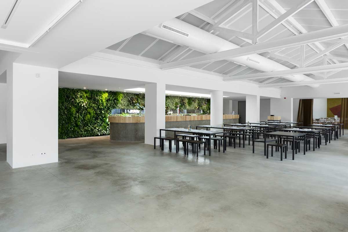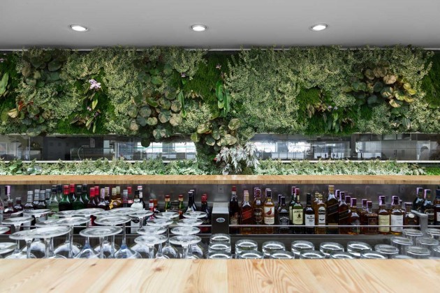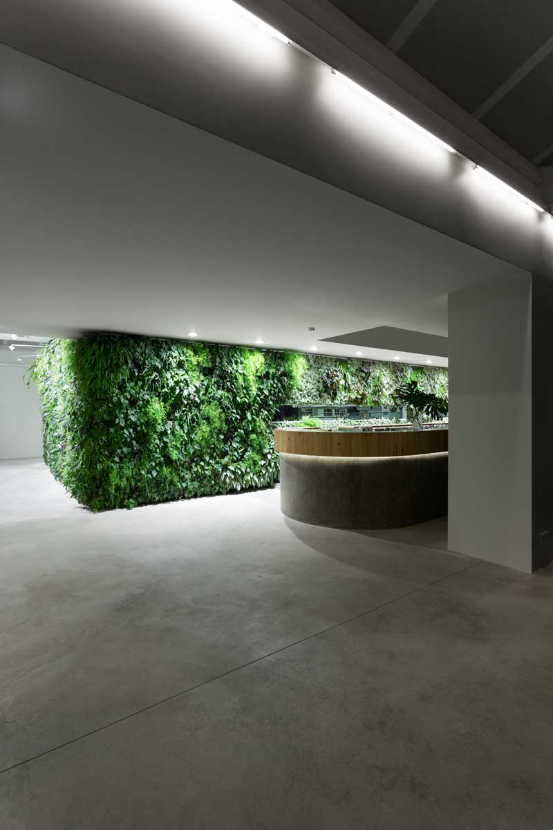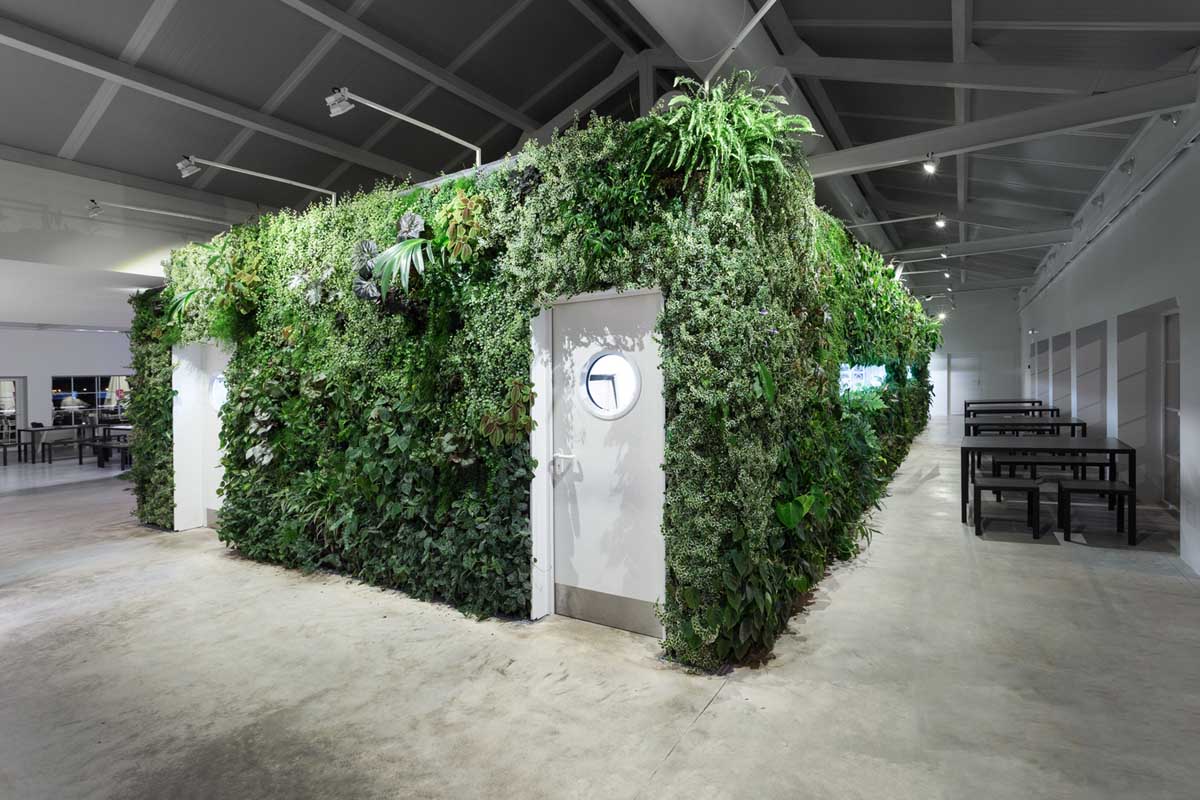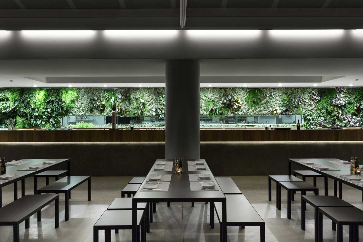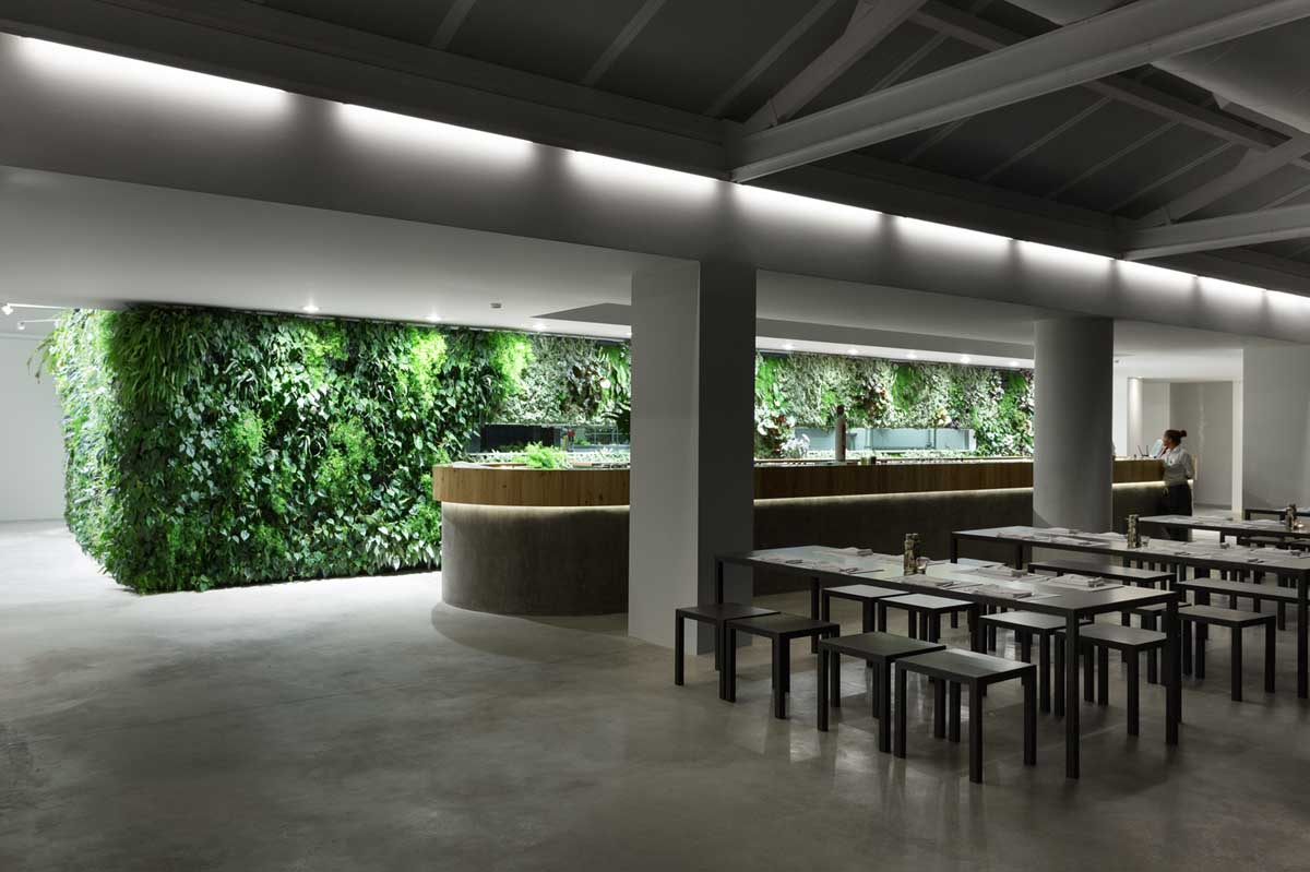 This 113m2 vertical garden is located in Espaço Espelho d’Água, a new restaurant/gallery/concert venue located next to the river in Belem, Lisbon. It wraps around the four walls of the kitchen that is inserted in the open space of this renovated 40s pavilion. Several windows cuts through the plant surface making a see-through space from side to side of the building.