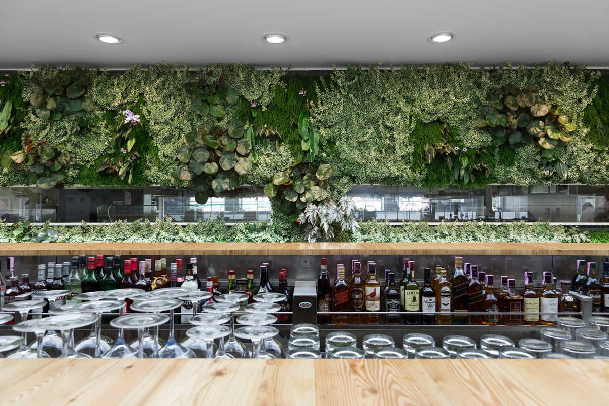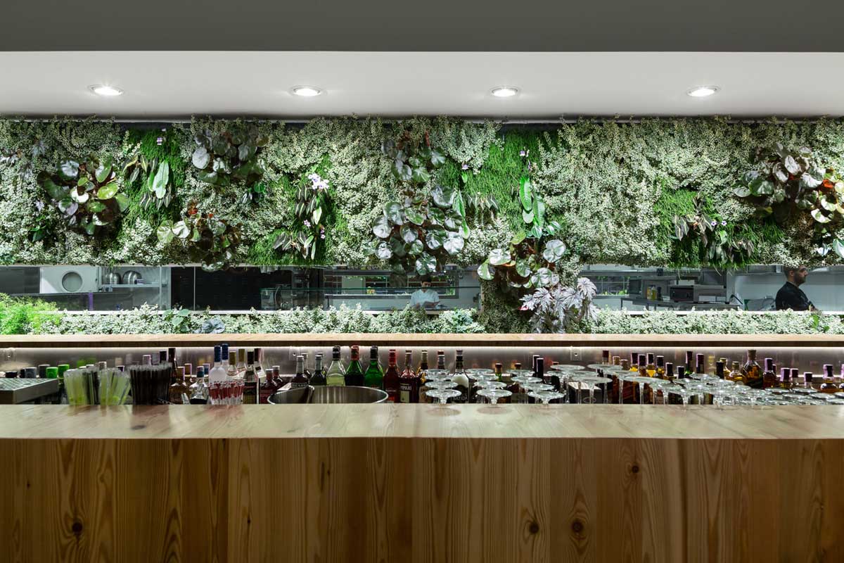 The side facing the bar seating have mostly varieties of Rhipsalis, Ficus, Begonia and Streptocarpus, creating a compact patchwork together with some flowers and colorful leaves.