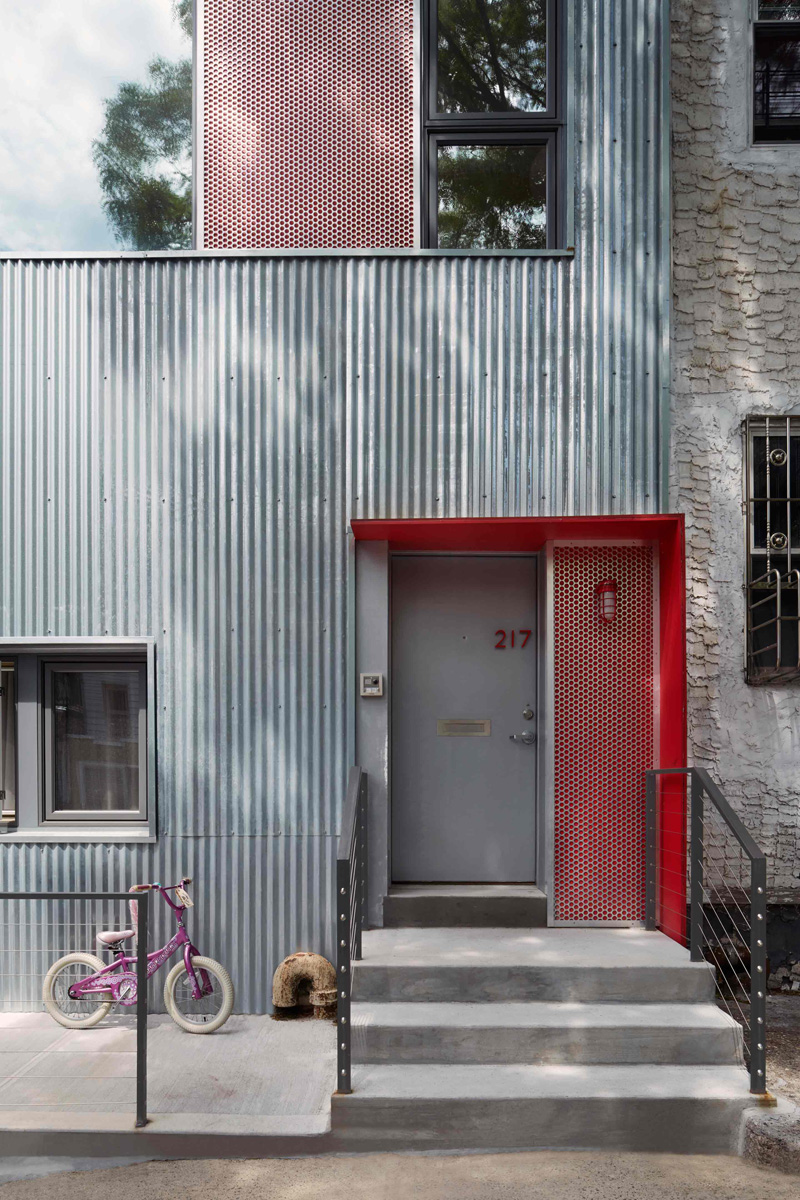 The primary cladding material-corrugated galvanized steel-was selected to blend in to the gritty, eclectic architecture adjacent to the site, as well as for its affordability. Framed accent panels of perforated aluminum installed in front of painted red panels provide complexity and balance to the facade. Red accents were used to frame the entry canopy and the frosted glass window in the Master Bathroom shower.