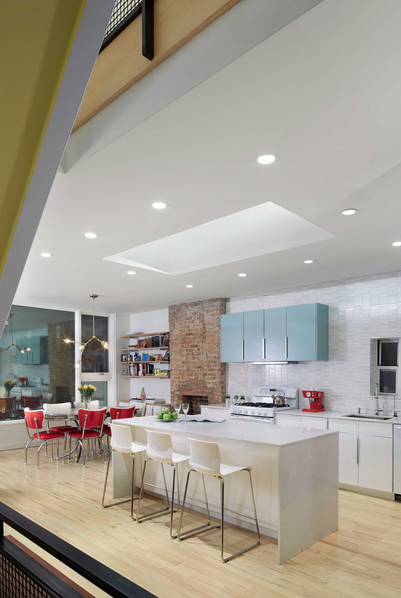 The Interior spaces equally emphasize traces of the original structure. An existing brick chimney breast became the organizing element for the primary living space on the lower level of the owner’s duplex, as well as the Master Bathroom on the top floor.