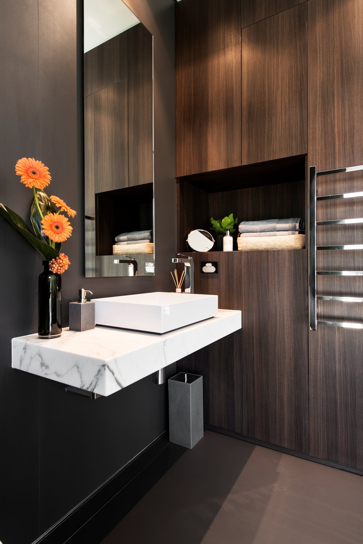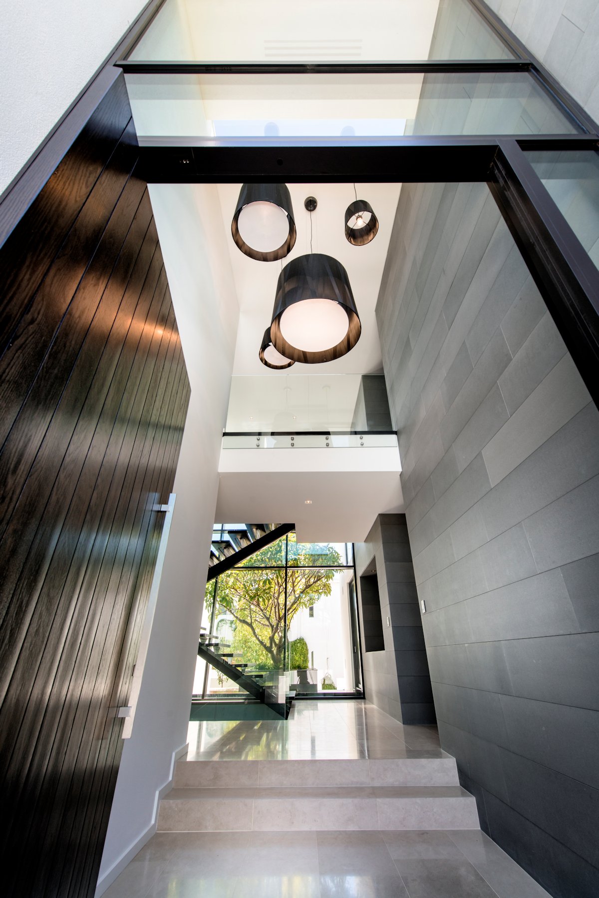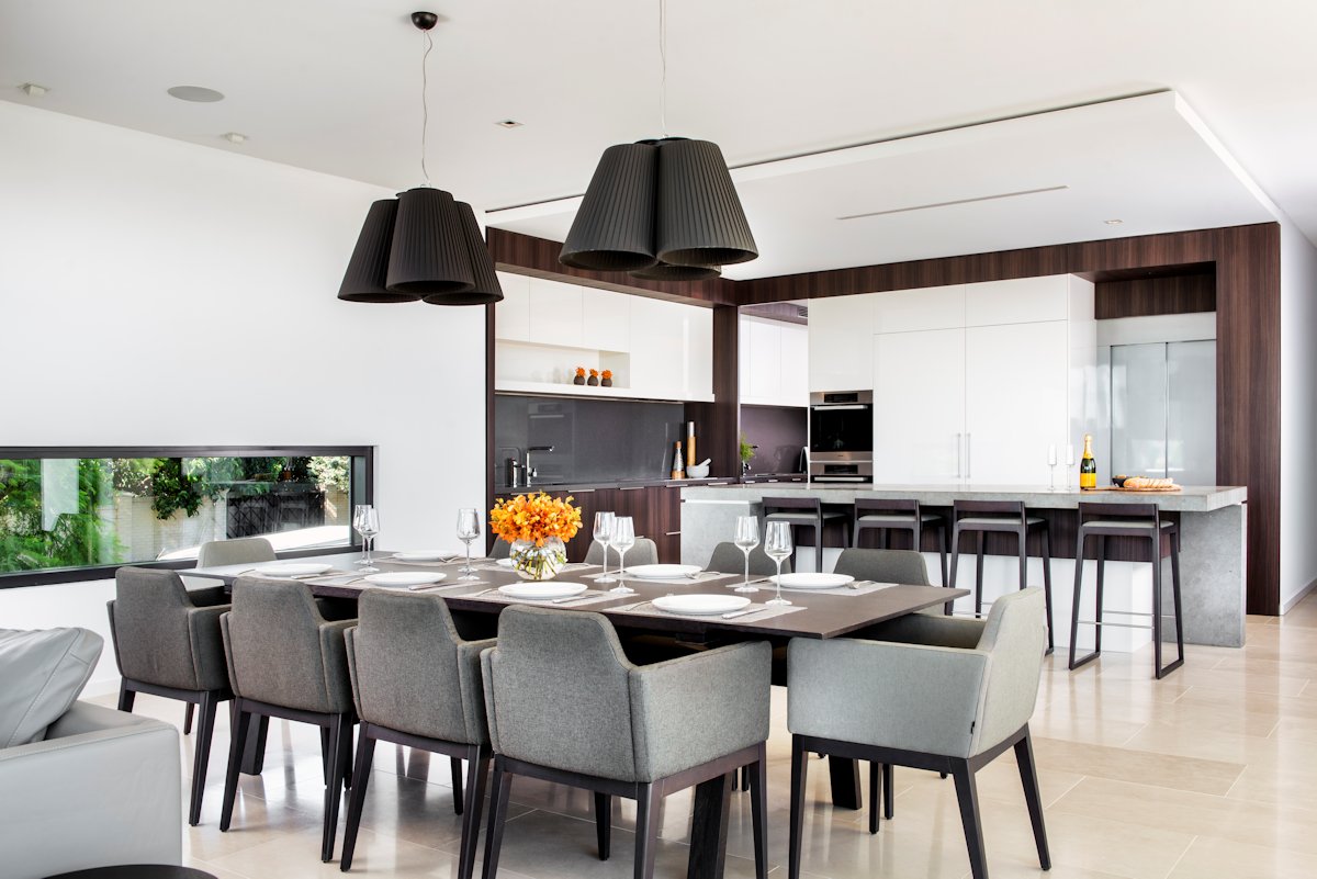 A 3m tall ebony-stained jarrah door opens onto the entrance foyer. A wall of windows overlooks a reflection pond, mature frangipani tree and sculpture set against a backdrop of a glass face rendered wall. In the entry is one of the home’s most spectacular features – the staircase. A feat of engineering, the staircase runs through all three storeys and features a suspended steel structure with oak treads stained a rich Japan black that complement the honed limestone floors.