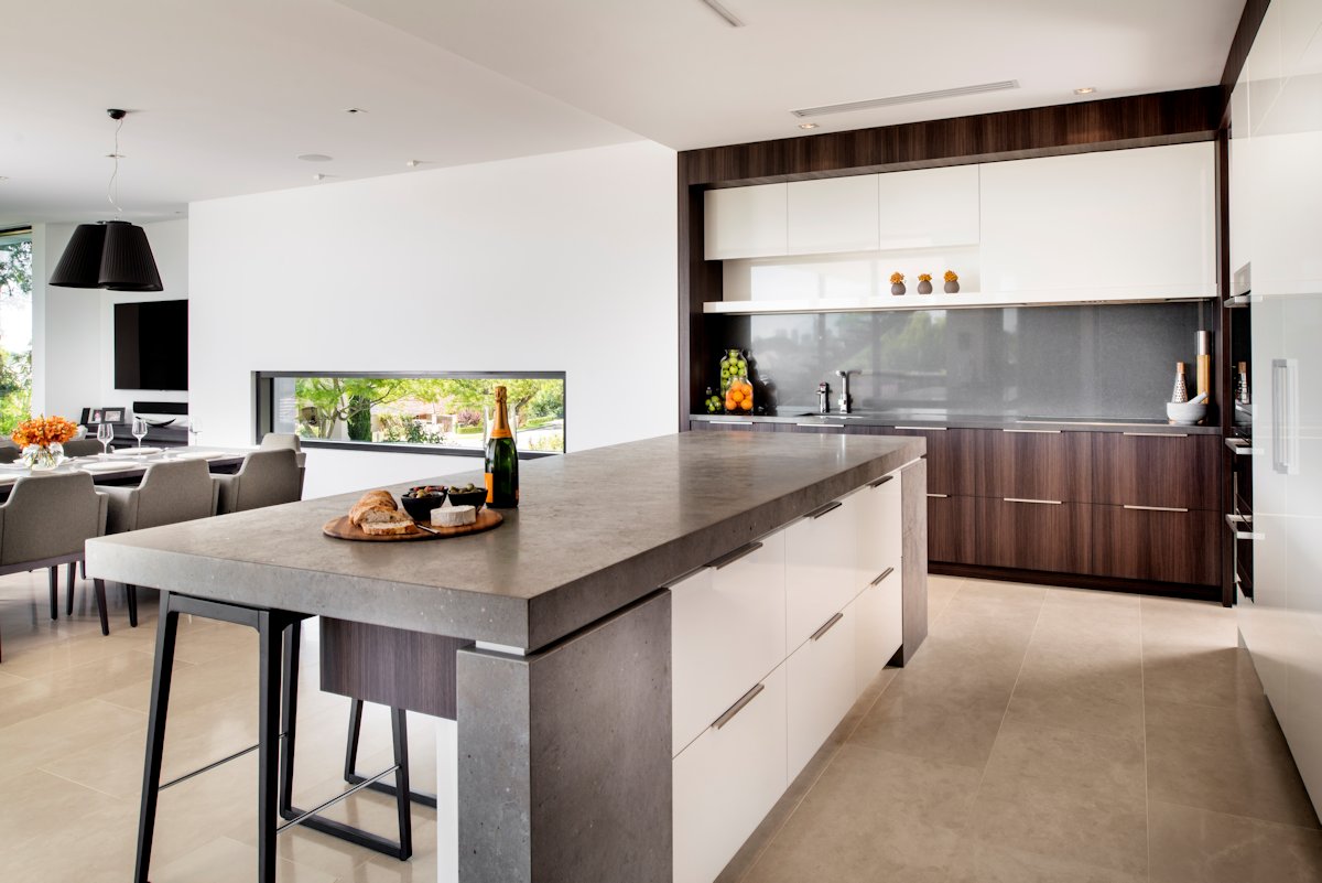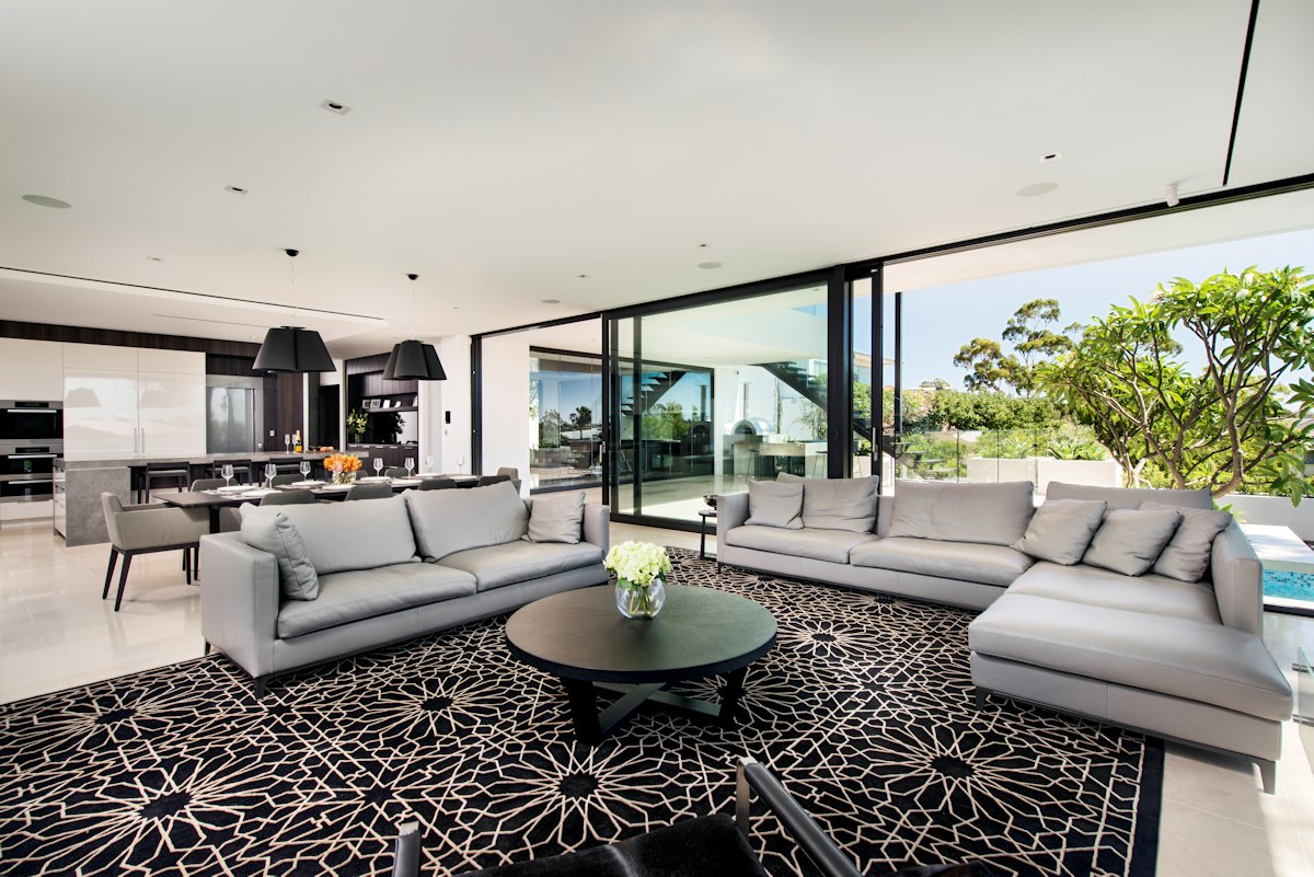 The open-plan kitchen, lounge and dining can also be opened up to the outdoors for effortless indoor-outdoor living and entertaining. The landscaped gardens include an infinity edge pool tiled in iridescent Bisazza mosaics that visually link the gardens to the sparkling Swan River beyond.