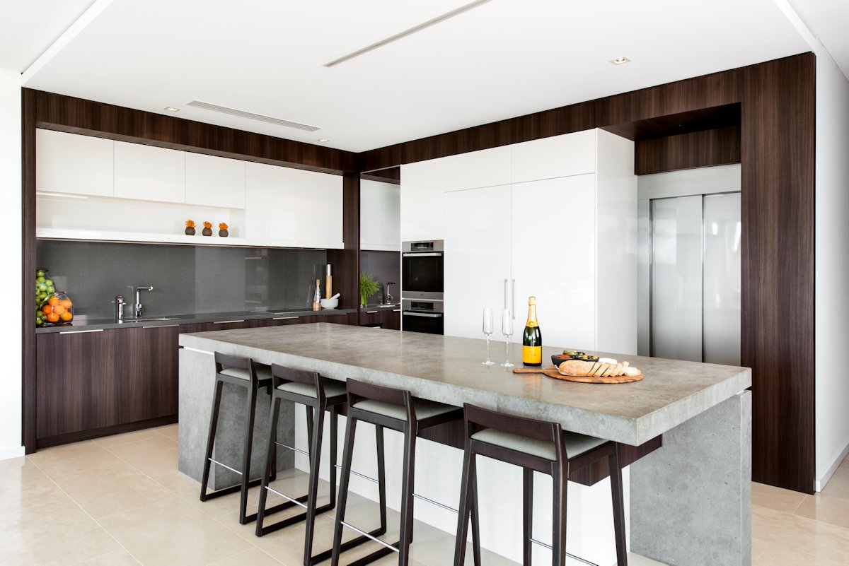 The clients wanted the design to have longevity and to cater for their teenage daughter and son for years to come. Five bedrooms and seven bathrooms encompass separate zones for the teenage children, as well as guest bedrooms for friends to stay over. A games room as well as a home theatre offer spaces for the children to entertain their friends, while parents have an upstairs bar and lounge, as well as a fully enclosable alfresco lounge and dining with its own bar, all set against river views. The hotel-like parents’ retreat has a wraparound balcony and views from the bed and ensuite that stretch across the neighbourhood to the river and city beyond.
