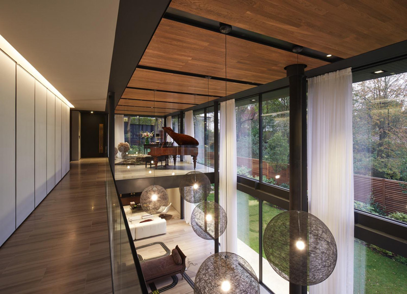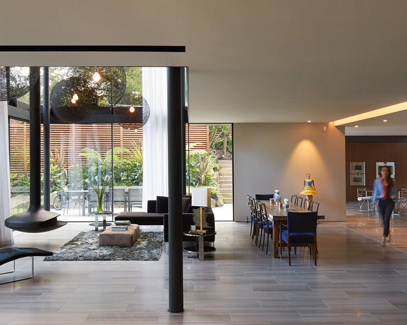 The bridge leads into the heart of the house, which opens up to views over a day-lit double-height volume down to the lower garden level. Large sliding glass doors dissolve the boundary between inside and outside with external stone paving extending into the landscaped garden which gently curves around the house.