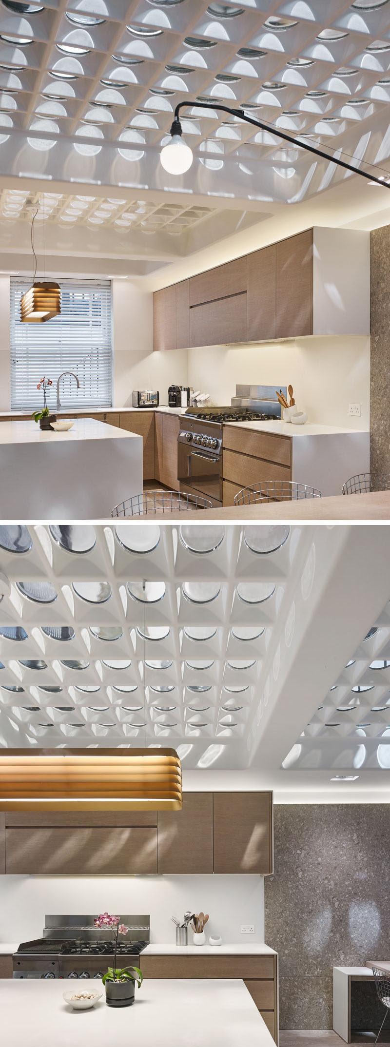 This modern house in London has a unique floor made from pavement lights that have been re-purposed to allow natural light to fill the two levels of the house.