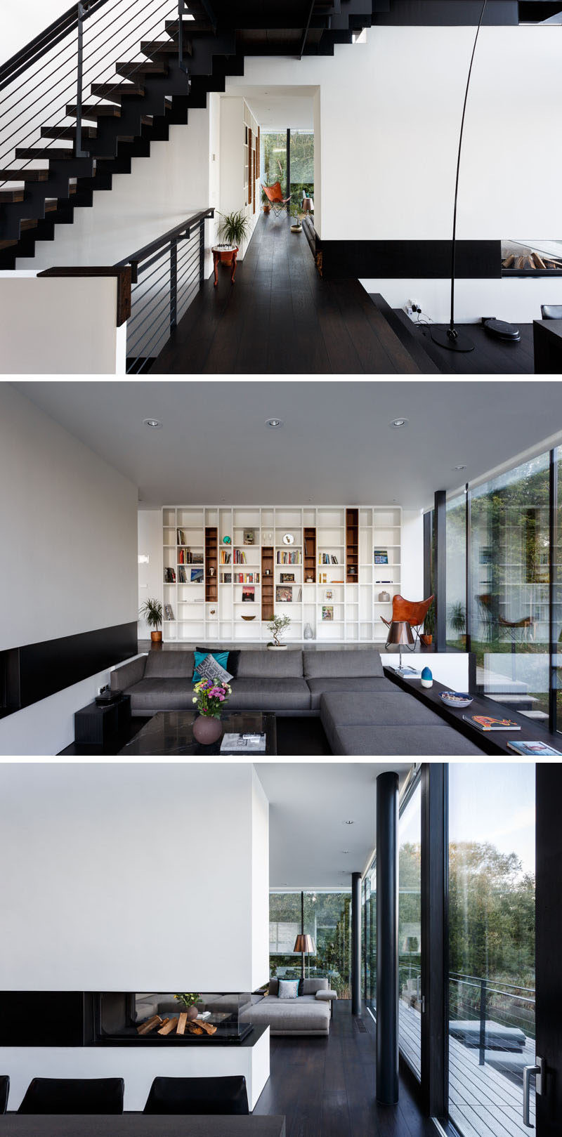 Inside, there’s a living room with a fireplace and a floor-to-ceiling bookshelf.