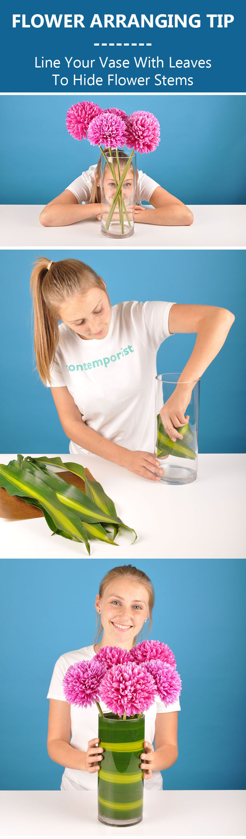 Here’s an easy idea for how to create a more unique flower arrangement when using a clear glass vase. If you wrap large leaves around the inside of the vase, you’ll hide the water and the stems and create a unique decor piece.
