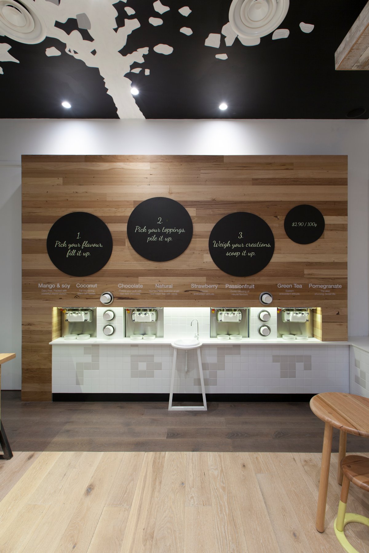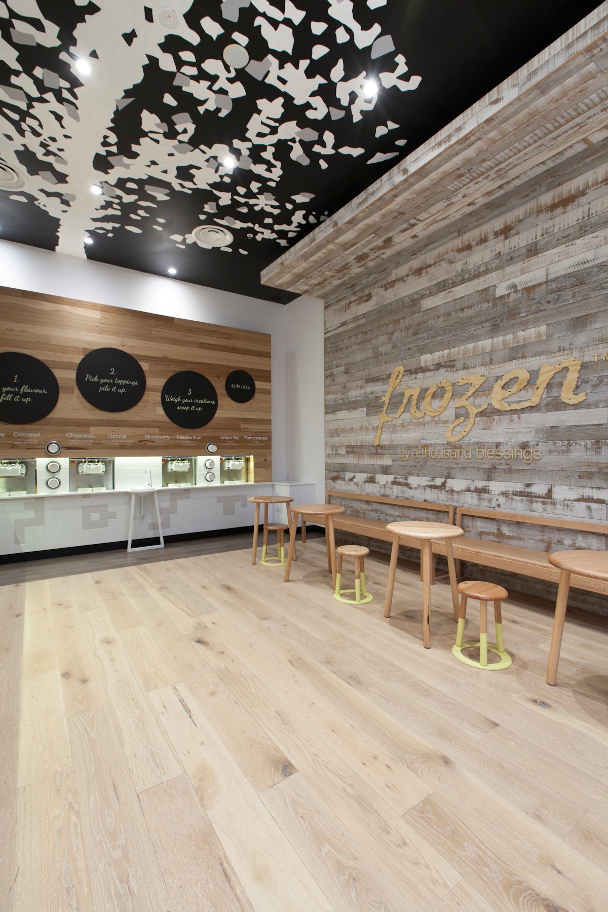 The majority of timber used in the fitout is recycled, from the toppings counter, the frozen yoghurt machine wall and the furniture, in an attempt to provide a sustainable and organic element to the space.The hand painted tree on the ceiling, designed by Pang & Haig, enhances the experience of the space.