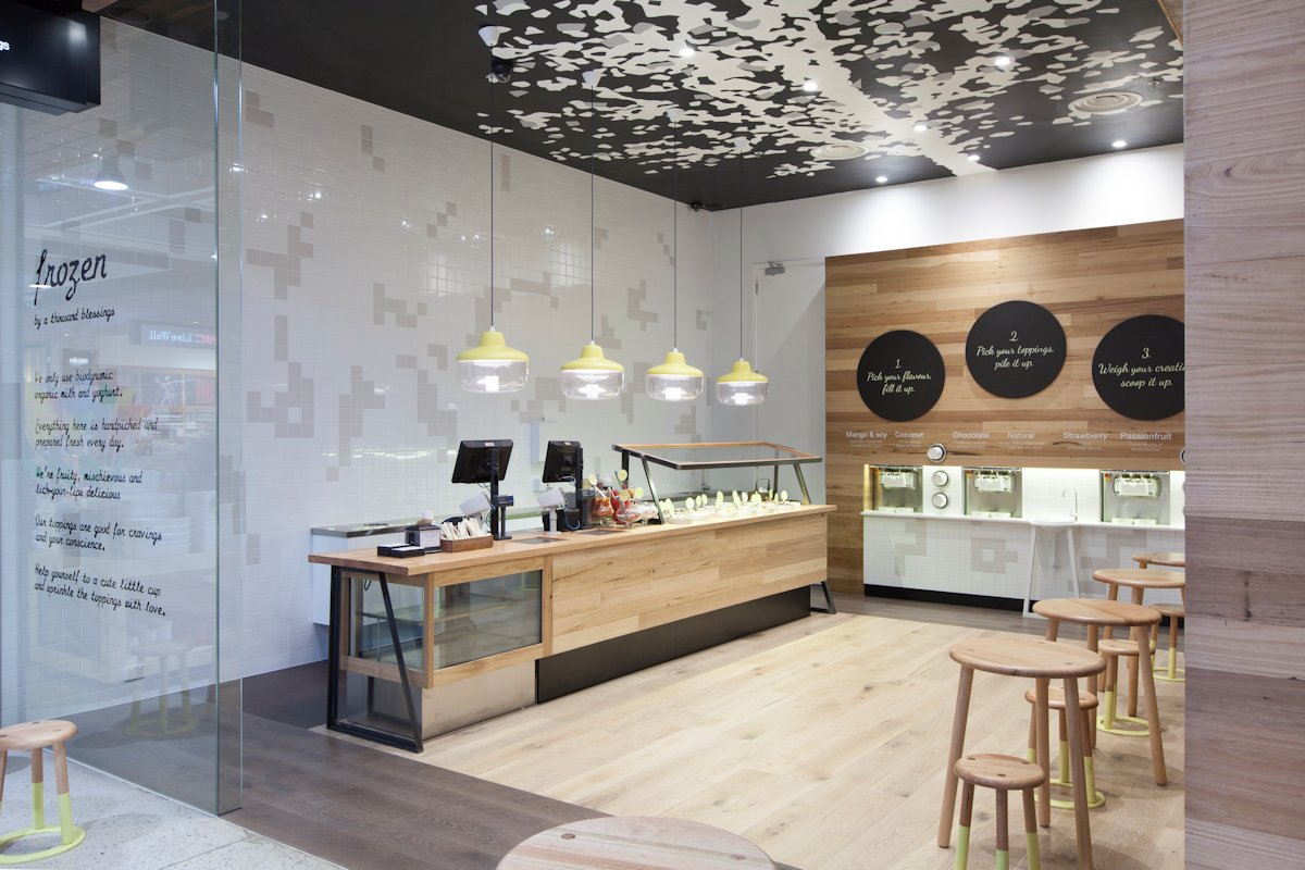 The design response involves a simple palette of materials which allow the bright coloured toppings to stand out, yet maintain a sophisticated fitout. Touches of yellow add a playful element to the space.