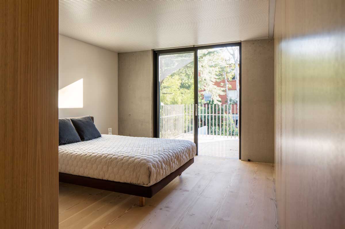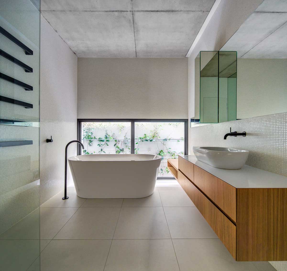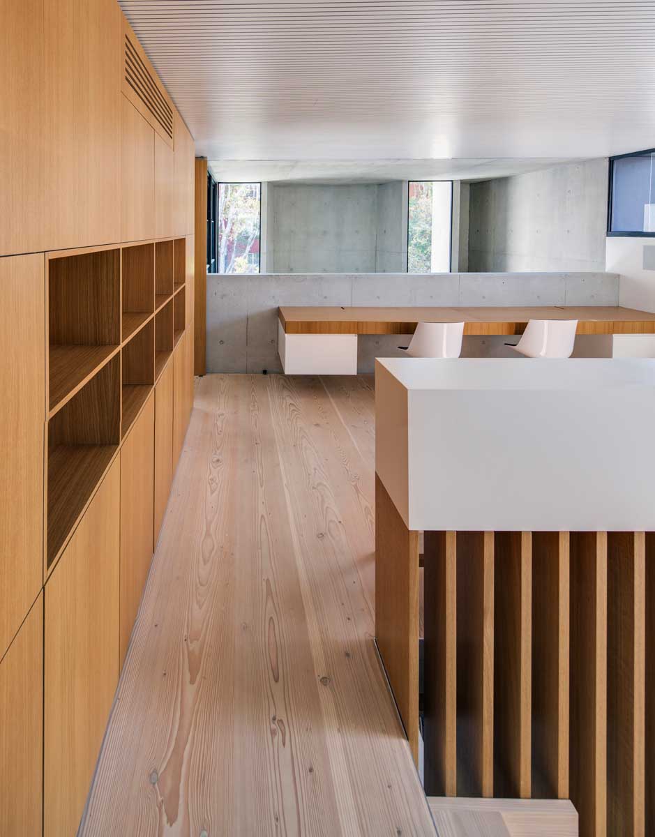 The project is not primarily focused on the connection to external spaces but looks inward with interconnections of cloistered spaces, created and selected framed openings. The outer concrete elements contrast with the timber elements that further define the various internal zones and functions within the house.