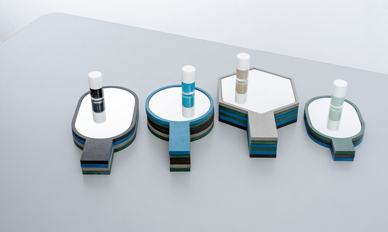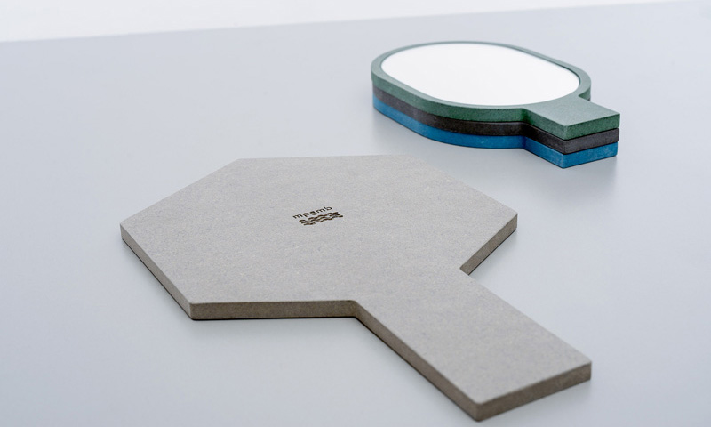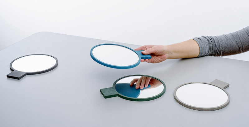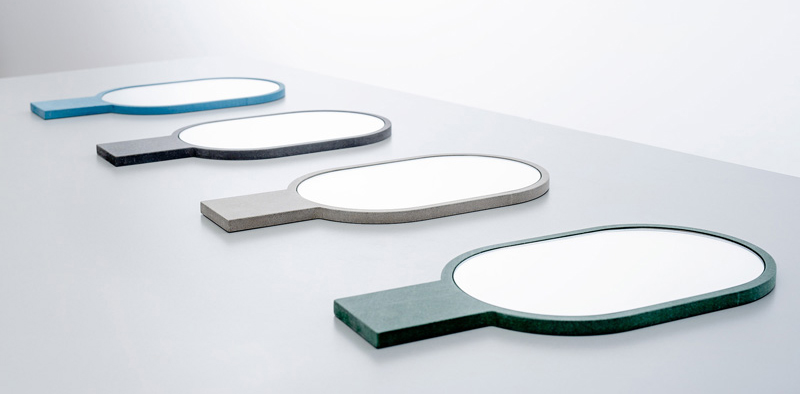 Marie-Pier Guilmain and Maud Beauchamp of design studio mpgmb, have created a collection of hand mirrors made with wood fibre panel coloured throughout with organic dyes.