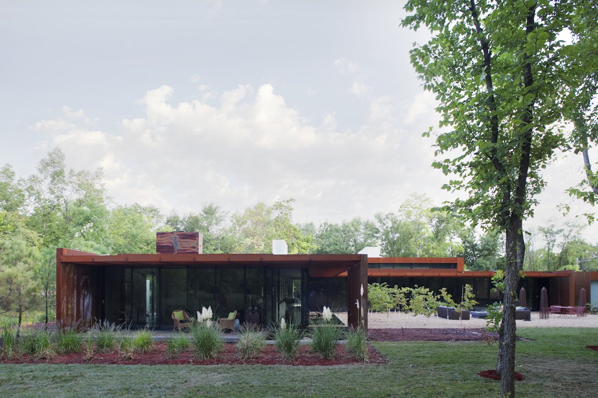 Heavy Metal is a contemporary take on the Miesian courtyard house, in a rural setting. In this instance, the courtyard is created as much by the landscaping and vegetation as it is by the architecture.