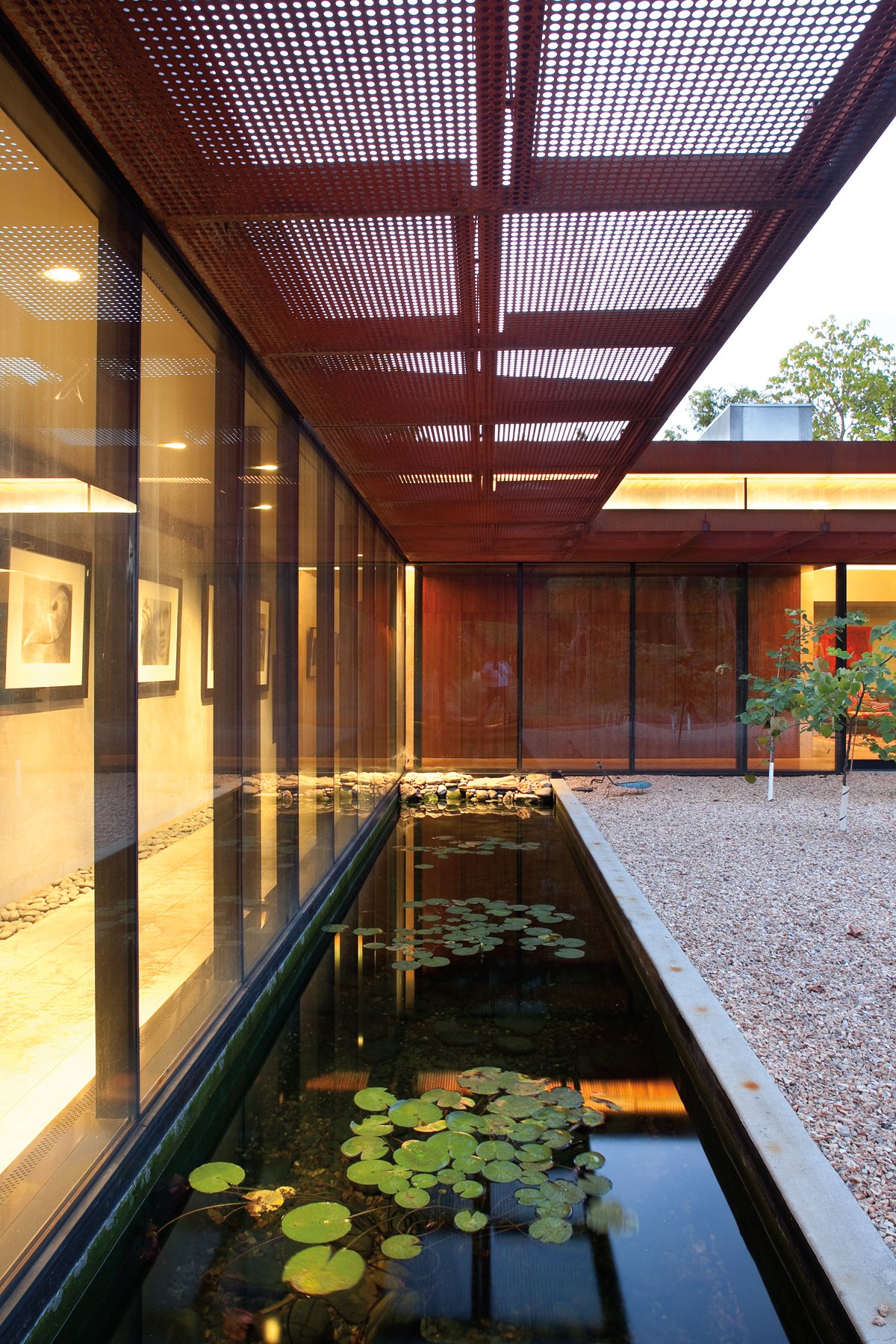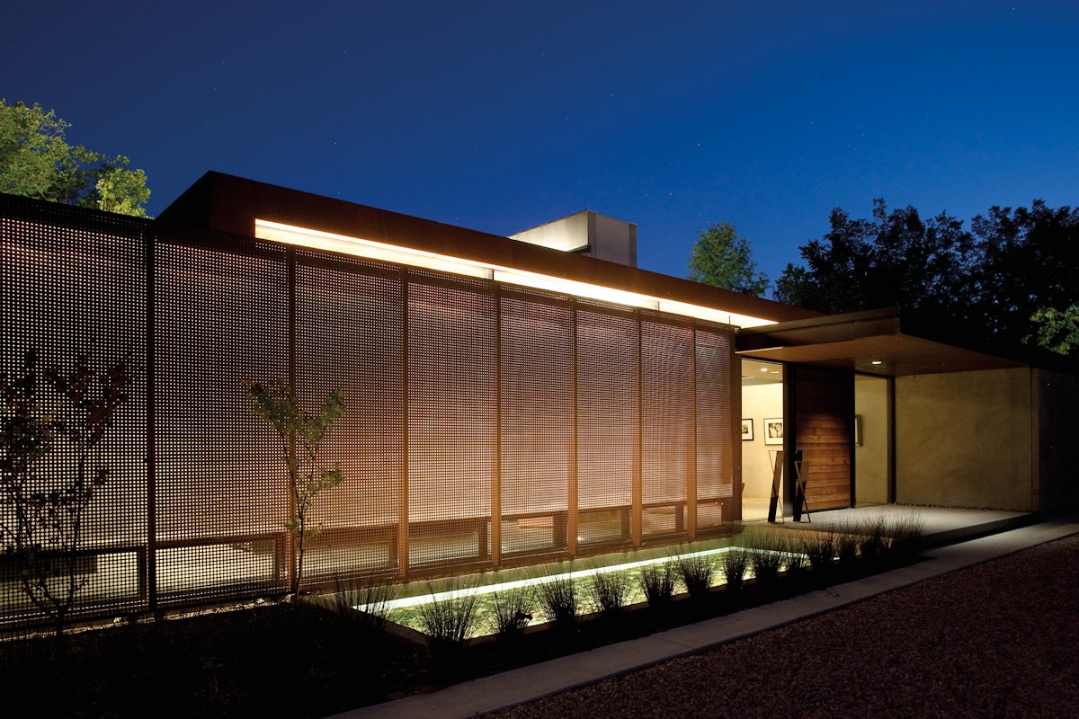 At night, the perforated metal skin and the reflecting pool are illuminated, while the entrance is highlighted with a single can light. The ceiling plane of the living room seems to float above the glowing clerestory.