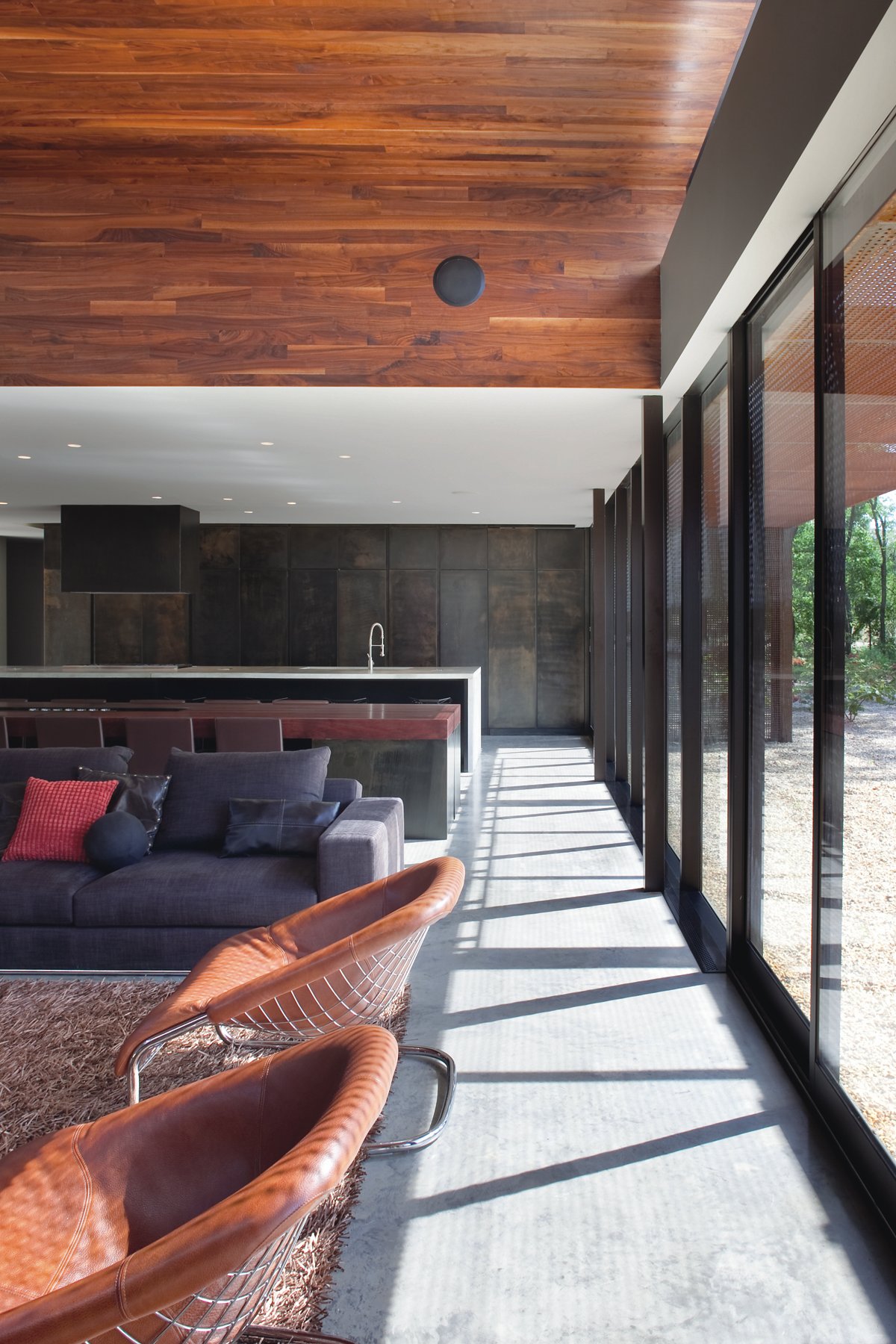 The skylights and sliding doors at the fireplace are characteristic of the best qualities of the house, plentiful natural light and a strong connection to nature. The strategic layering of glass and perforated steel shades the interior of the home and provides views of landscape around it.