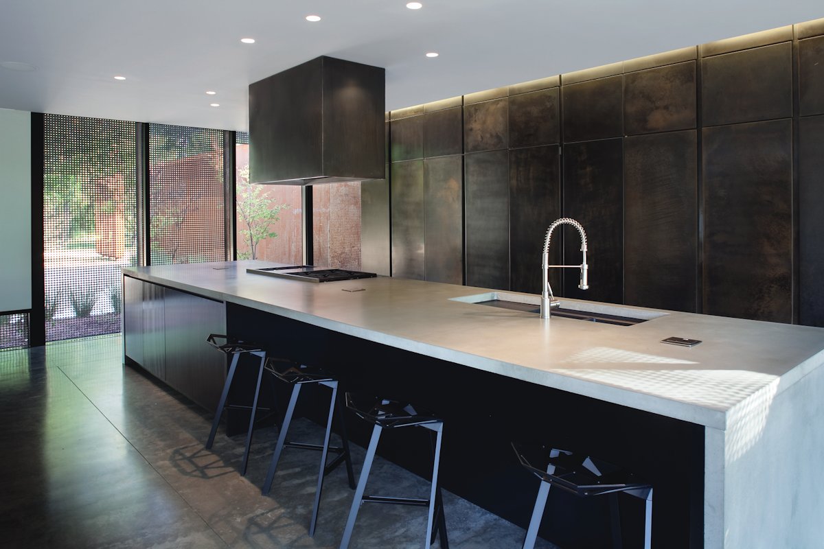 The kitchen anchors the large living space. The concrete countertop and blackened steel-faced casework appear minimal and monolithic.