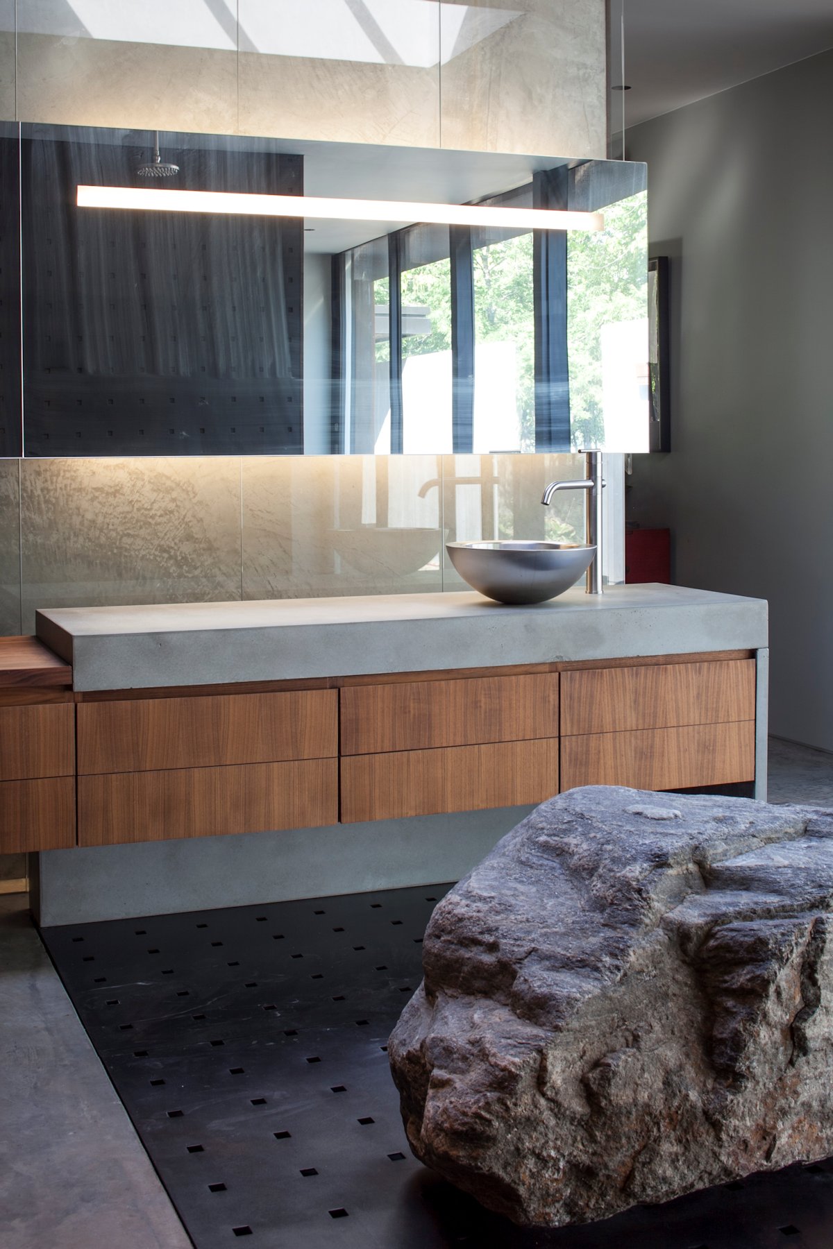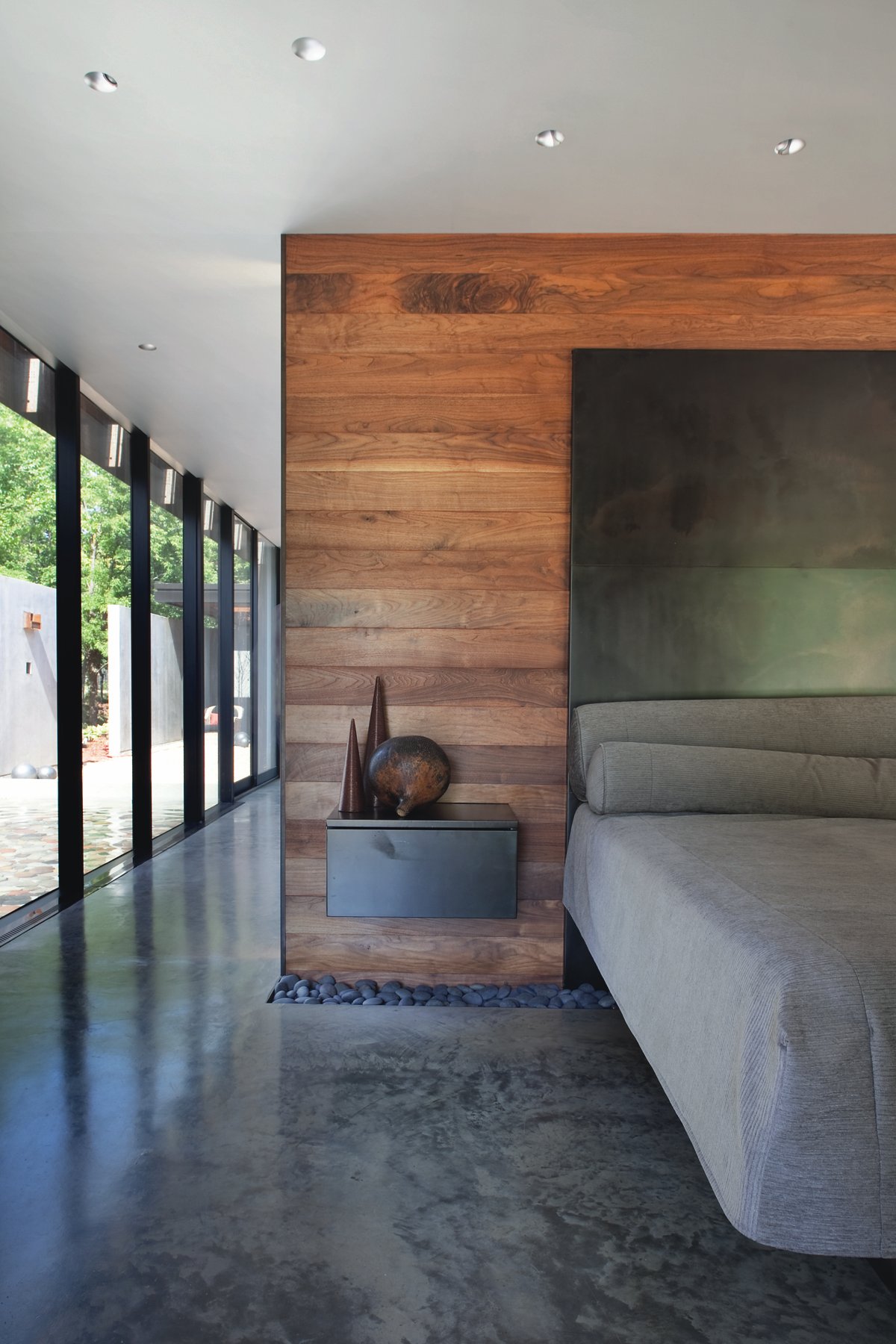 The master bedroom features a palette of polished concrete, blackened steel and unfinished wood. In the master bathroom, the vanity and shower look out on a secluded reflecting pool.